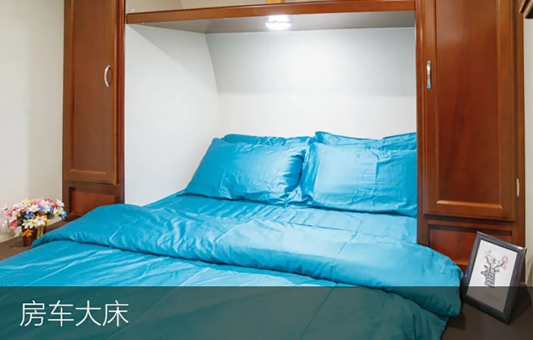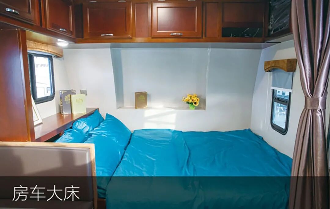 房车内部地板采用高级地板革,防水防滑的同时兼具耐磨特性;家具方面,均为全实木材质打造。