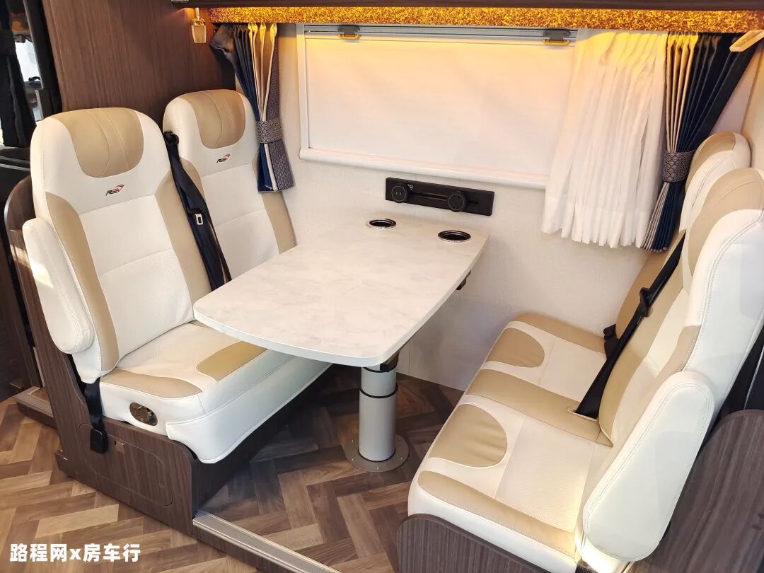 会客区位于驾驶舱后方、左拓展机构内,设有可供四人乘坐的卡座;座椅均设有安全带,保证乘坐安全;车窗装有隐私窗帘,用于保护车内空间的隐私;卡座中心设有可调节升降餐桌,可用于日常就餐。
