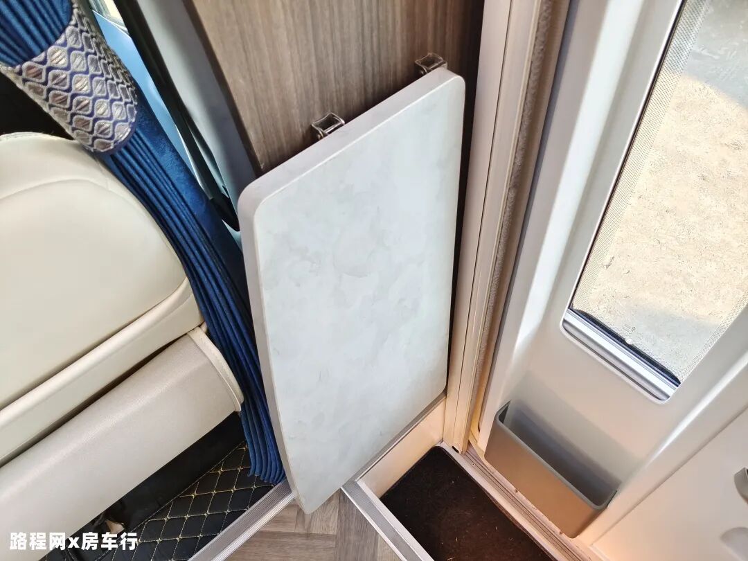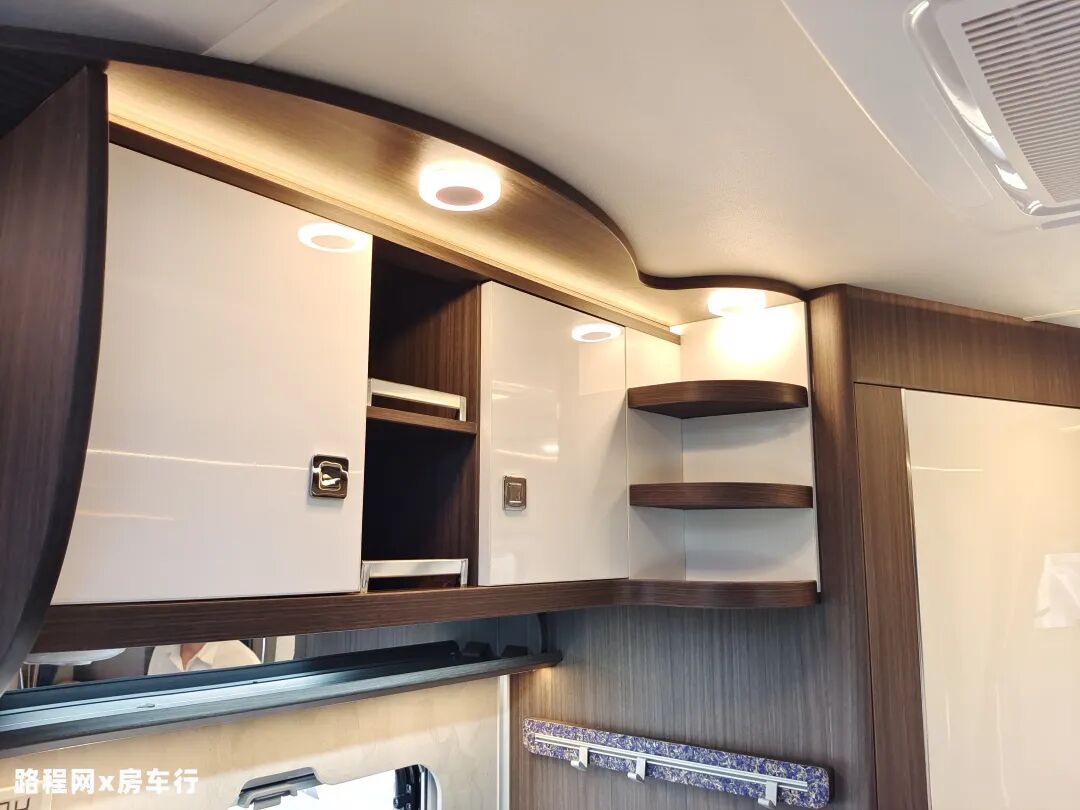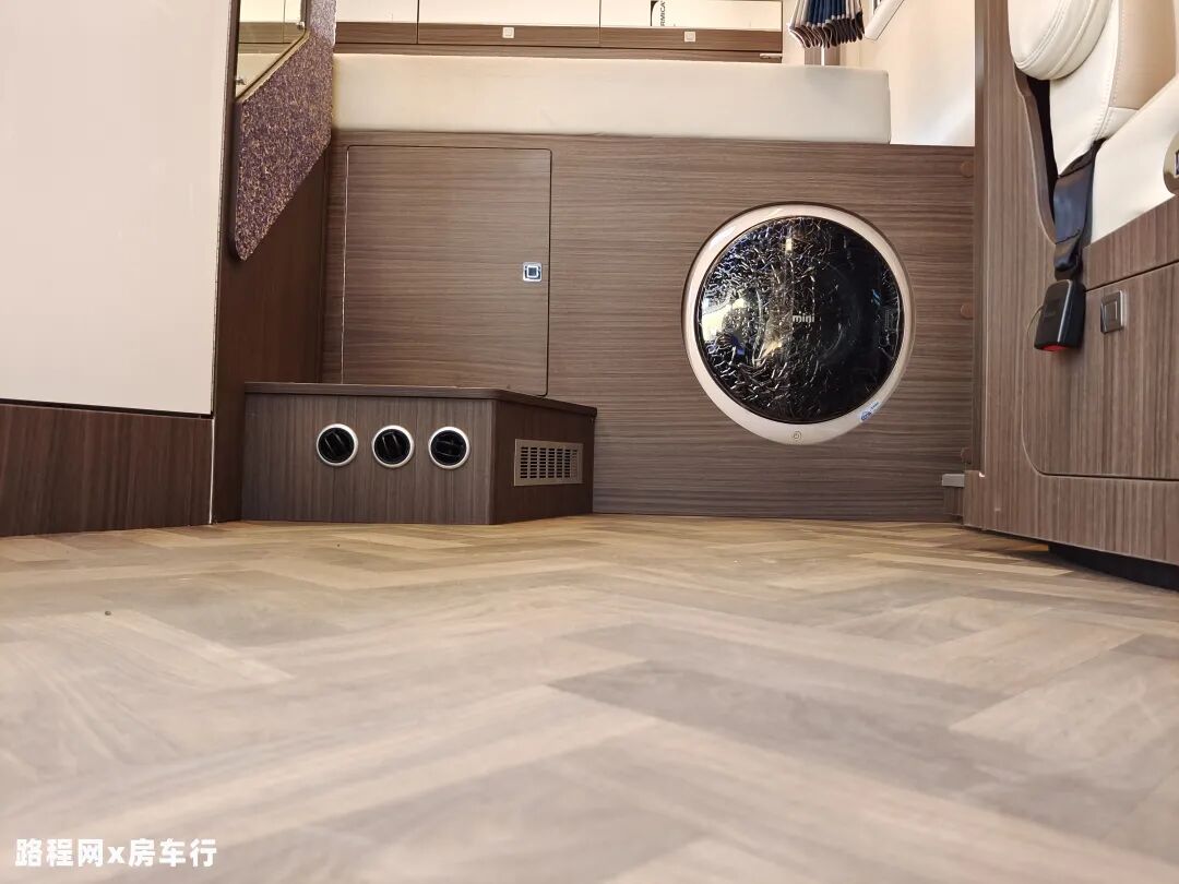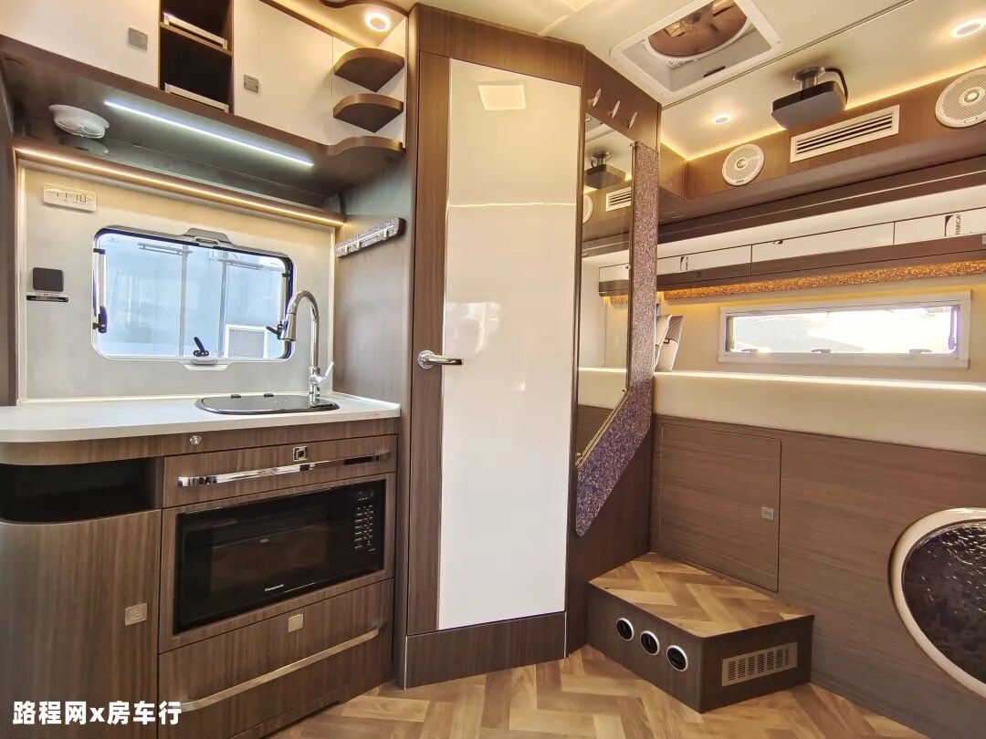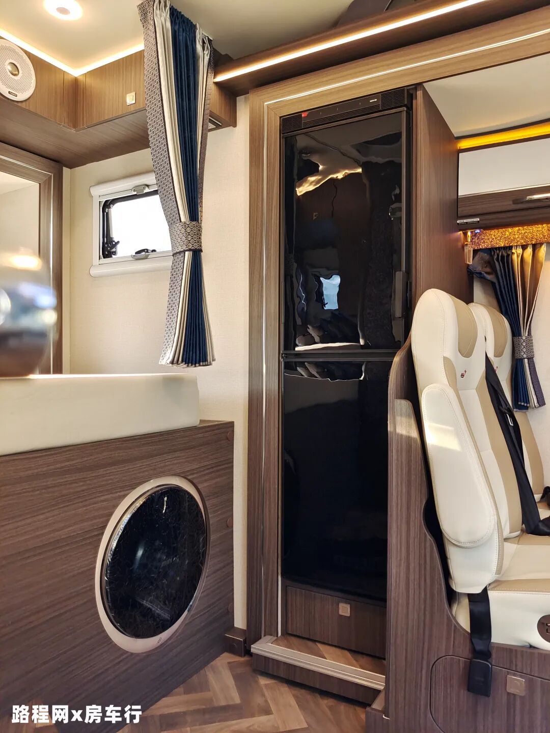 双开门房车专用冰箱位于会客区后方,与厨房搭配使用。