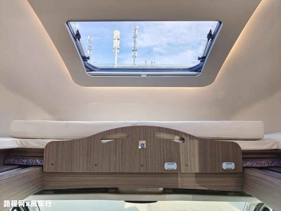 驾驶室上方为额头床,设有专用爬梯及防护栏,提供了安全的睡眠环境;内部空间充足,可满足成年人的睡眠需求;顶部设有天窗,两侧设有小型窗户,不仅可以欣赏车外风景,打开后还有助于车内空气流通;额头床采用推拉式设计,和折叠式设计相比更为方便。