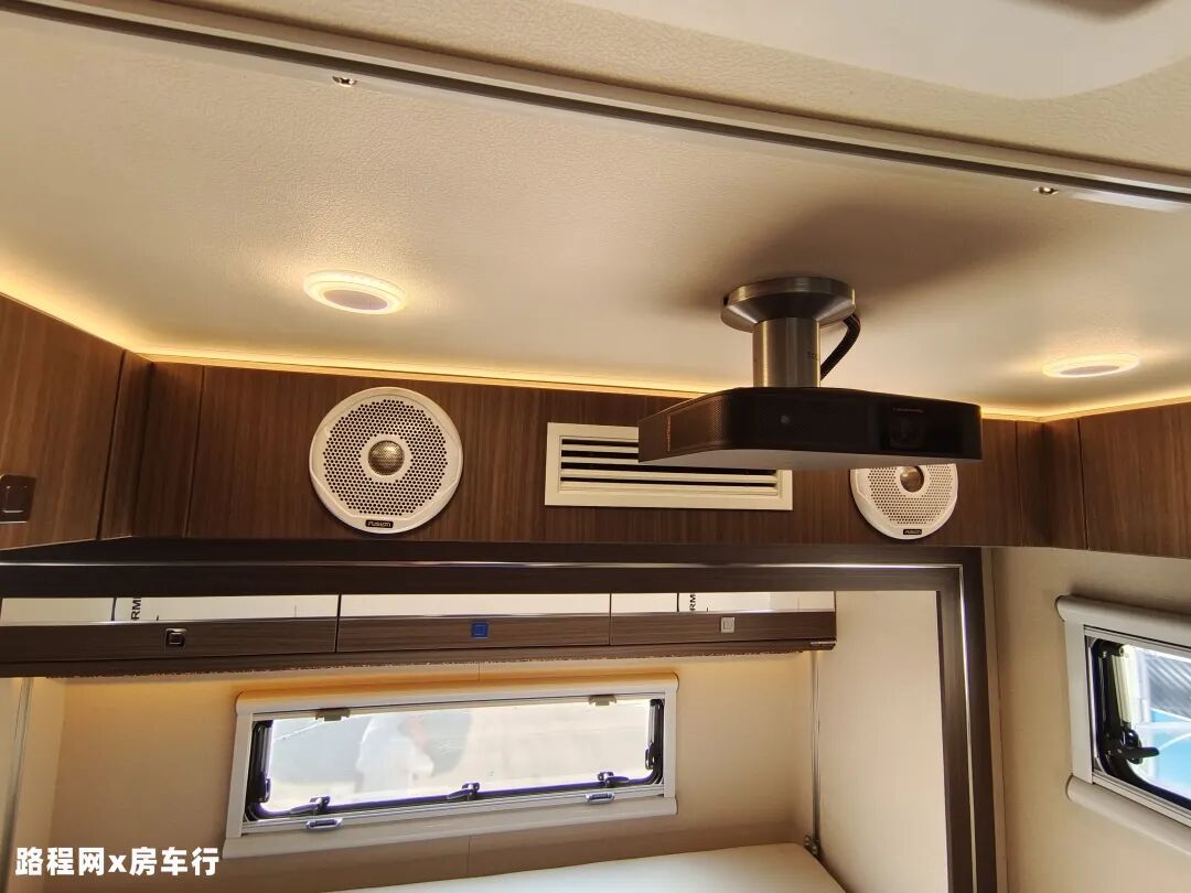 尾部休息区还装有60寸投影仪及进口音响系统,可实现播放视频、歌曲等娱乐功能。