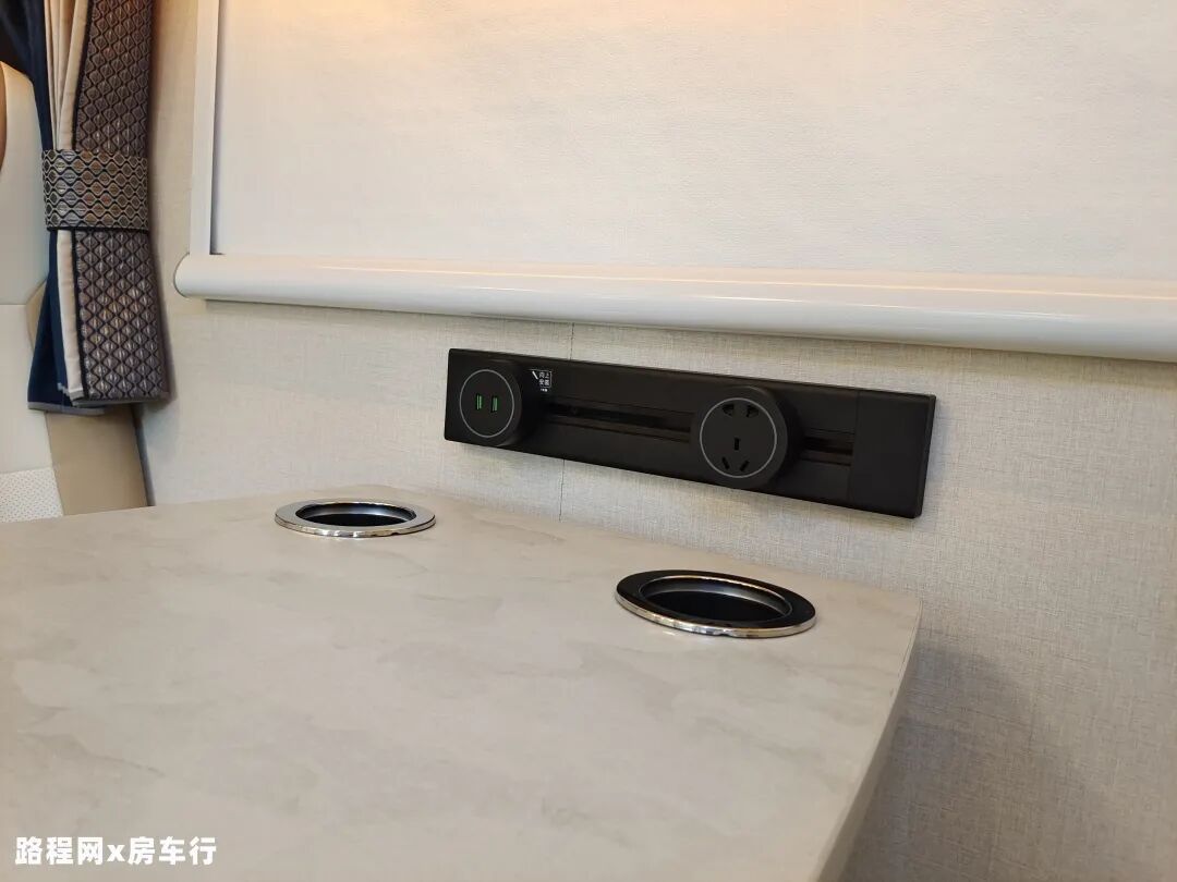 餐桌上方设有五孔插座和两个USB接口,两个插座均可横向移动,方便日常使用。