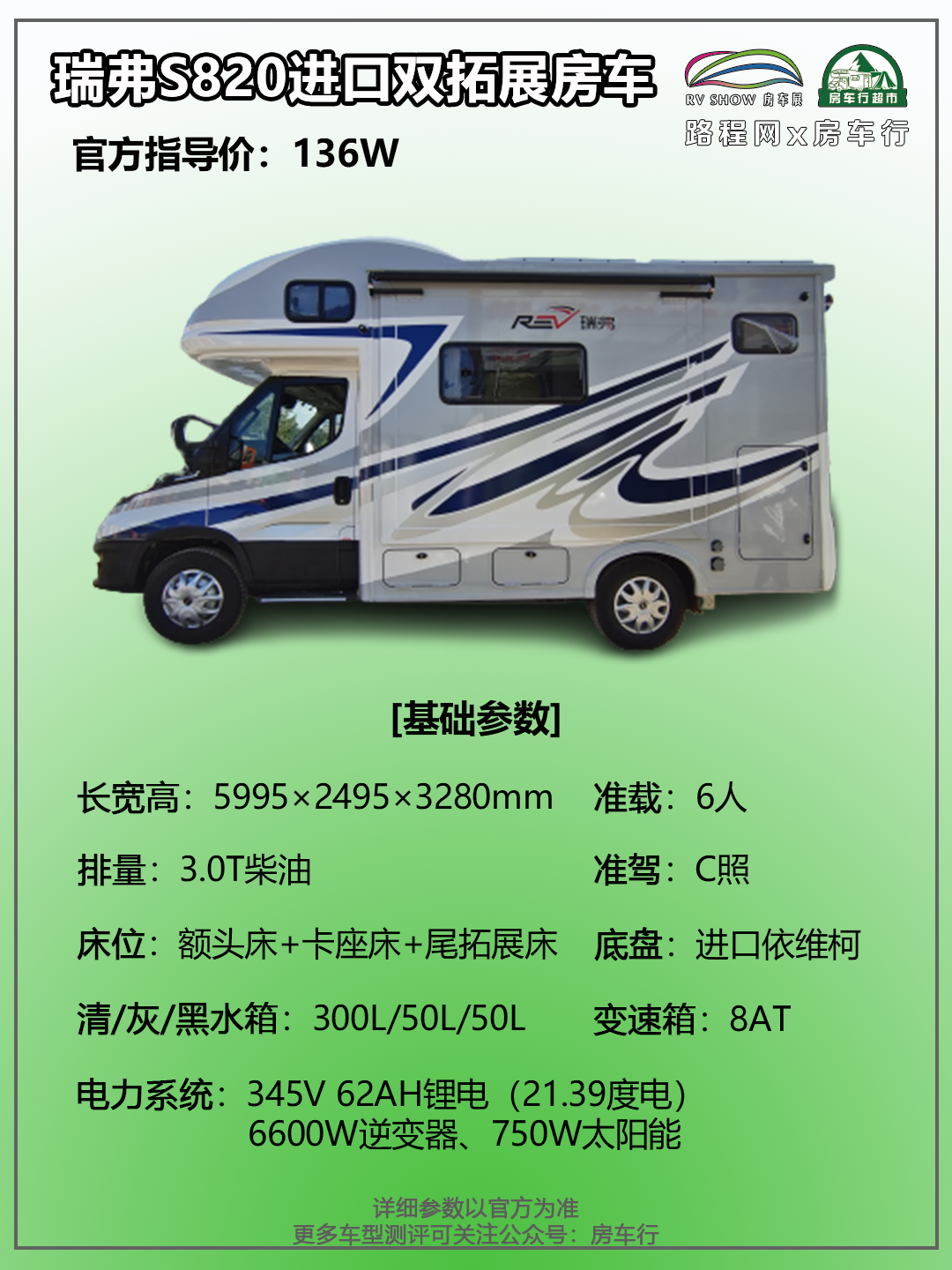 水电方面,瑞弗S820标配6600W逆变器、750W太阳能电池板、345V 62AH锂电池(约等于21.39度电)、300L净水箱、50 L灰水箱、50L黑水箱、美标食品级进口全自动水路等。另外,整车还配有高效空气净化系统、智能感应紫外线消毒器、液化气报警器等设施。目前,这款瑞弗S820进口双拓展房车的官方指导价为136W,大家觉得怎么样呢?欢迎评论区留言讨论!