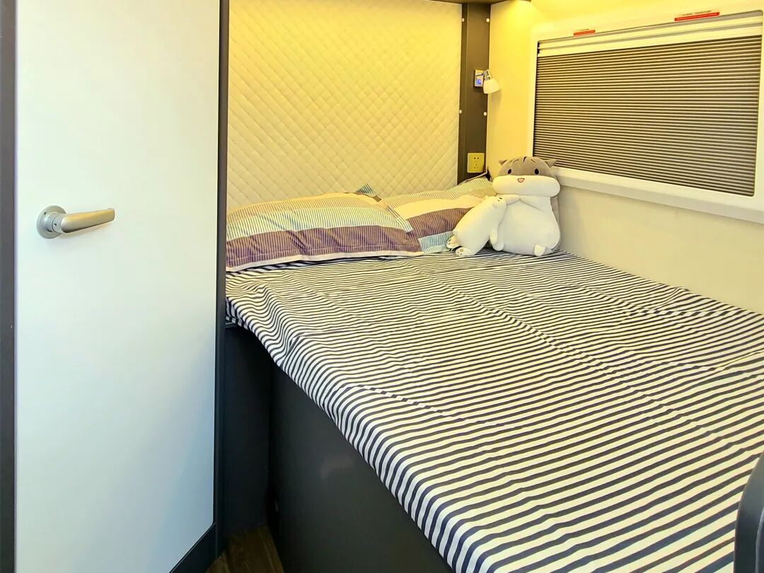 卧室在车辆尾部,纵置双人床的布局设计,床铺旁配置有阅读灯和插座,这对于离不开电子设备的当代人来说,是非常重要的。外推窗设置防蚊帘和遮阳帘,根据需求随心所欲,同时增加车内的采光和通风。