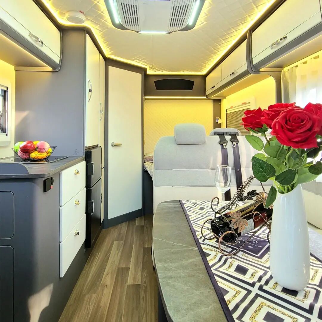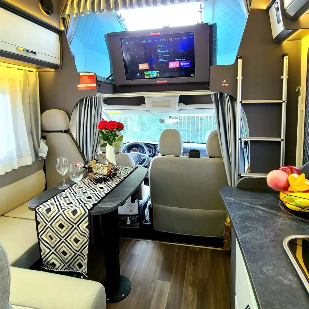 会客区设计L型沙发卡座,手感舒适,配有仿大理石材质可升降餐桌,降下后卡座区域可拼床,实用性高。配备32英寸互联网液晶电视,让旅途生活更加丰富多彩。房车专用顶置空调,冬暖夏凉,享受品质生活。