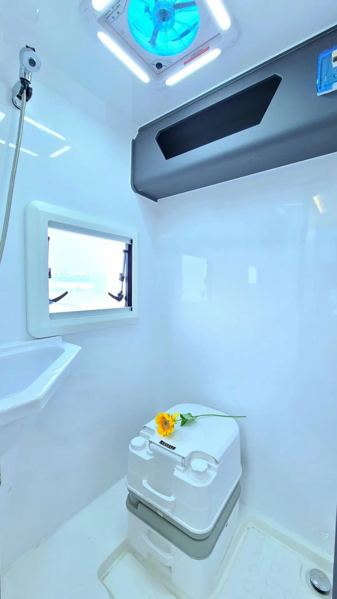 独立卫生间内配备了淋浴花洒、毛巾杆、浴室镜、卫浴帘、洗手盆、储物吊柜等基础设施。230L净水箱可满足多日使用,即使在寒冷的冬天,也能让您和家人在户外享受到温暖如春的淋浴体验。