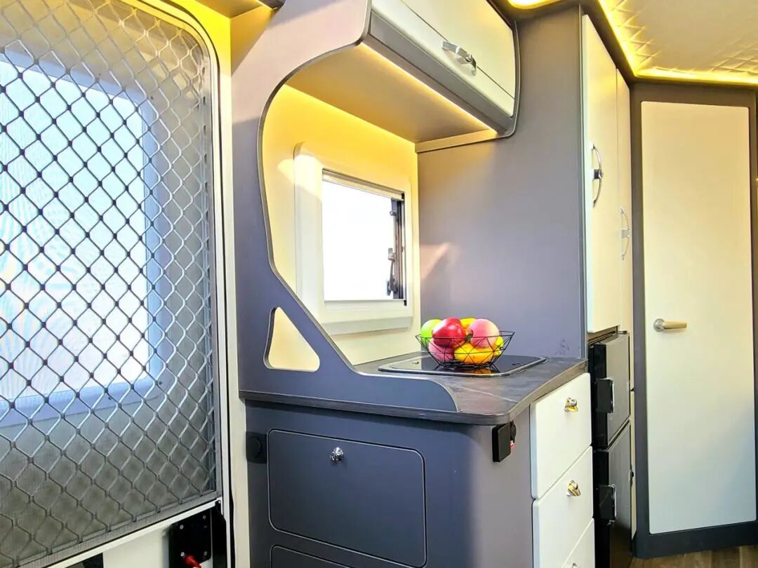 厨房区域配备房车专用85L冰箱以及嵌入式900W电磁炉,此外车身外侧还配置抽拉式燃气灶,进一步拓展生活空间,体验户外野餐的别样魅力。灶台上方和下方均有储物空间,可以放置调料等厨房用品。