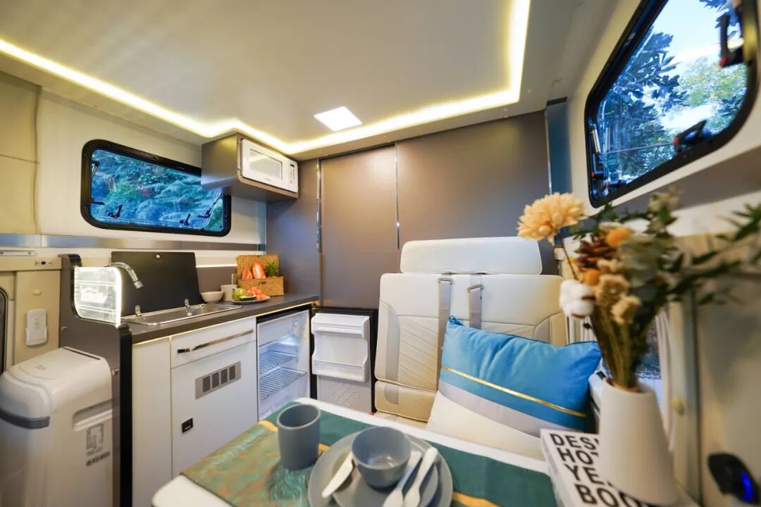 厨房区与卡座相邻,配置了非常丰富的设施,车内做饭想必也不是什么问题;但在图片中不难发现,厨房与卡座的后方还有一道隔断门,猜猜里面会是什么?