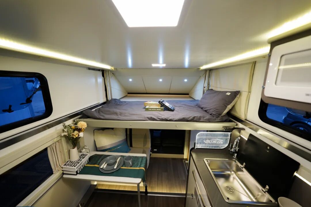 新车在不升顶时,车身高度不到两米,但在行车时后方载人是完全没有问题的,同时车内空间规划的十分合理,不管是升顶还是降顶,生活区各功能区都能做到互不干扰,错落有致,整体给人非常享受和舒适的体验,关于这些从下方的视频可以很直观的感受到;