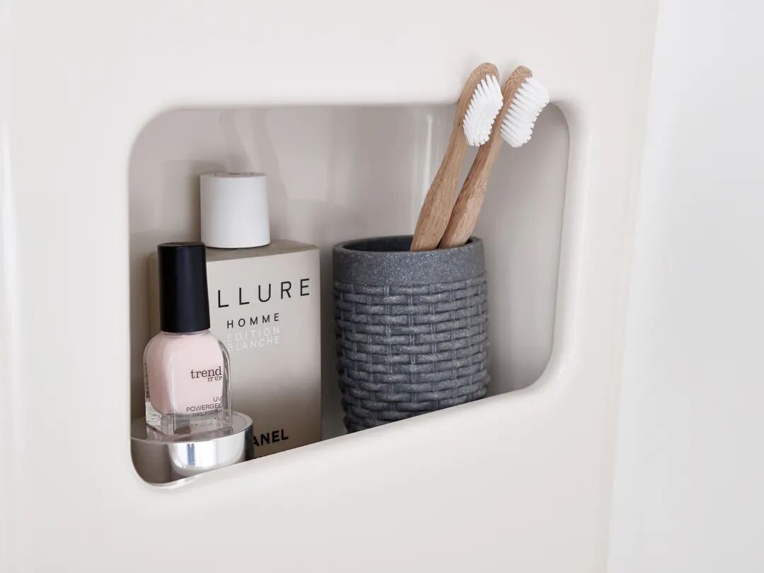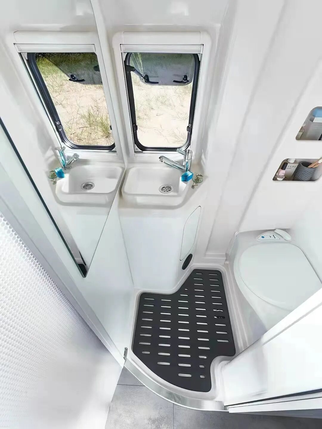 采用游艇设计的卫浴区,增添了James Cook房车的华丽感 。墙面储物空间的细节设计及马桶平行布局,不仅看起来高端大气,还能进一步提升空间的使用率;卫浴设施方面配备独立水龙头、洗手盆、房车专用马桶、化妆镜、抽拉式淋浴头等,满足旅行卫浴、洗漱需求。