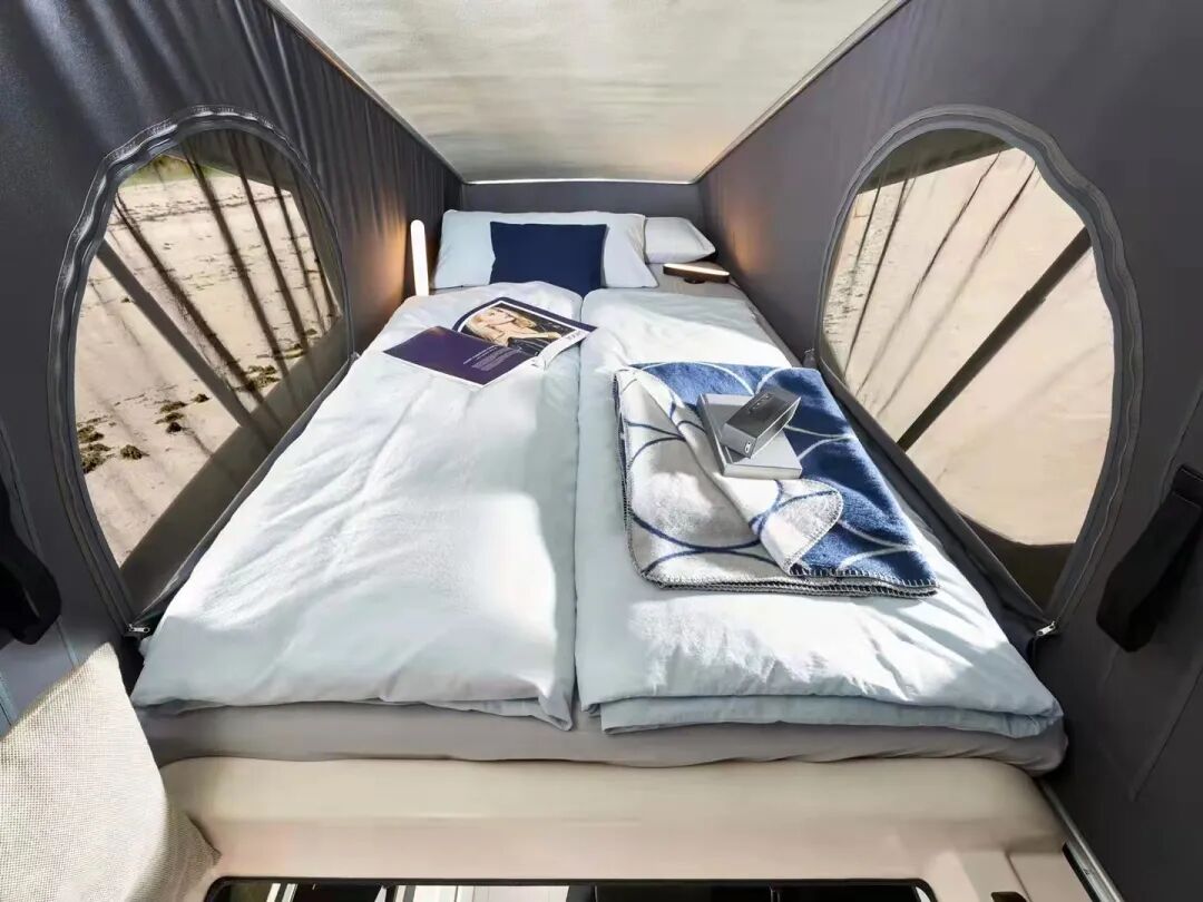James Cook的空间设计采用了可升顶结构及尾部拓展机构,提升了整车居住的舒适度。日常行驶时,收起可升降顶和尾部拓展机构,方便行车;驻车后打开,扩大睡眠空间和内部使用空间。