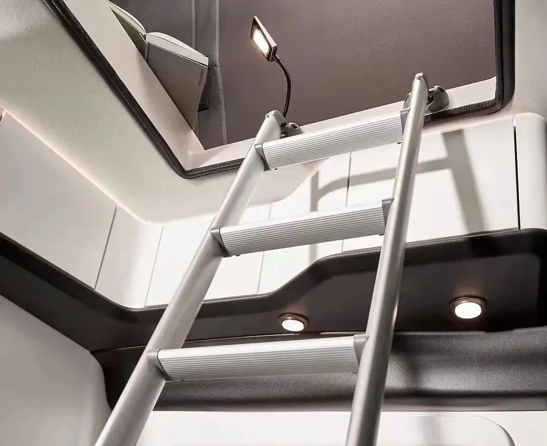 会客区上方的可升顶结构,是这款房车的一大亮点。和普通B型房车相比,James Cook的升顶结构,让它有了更丰富的睡眠空间。驻车后打开可组成一张双人床,供日常休息使用;床的尾部设有爬梯方便上下。