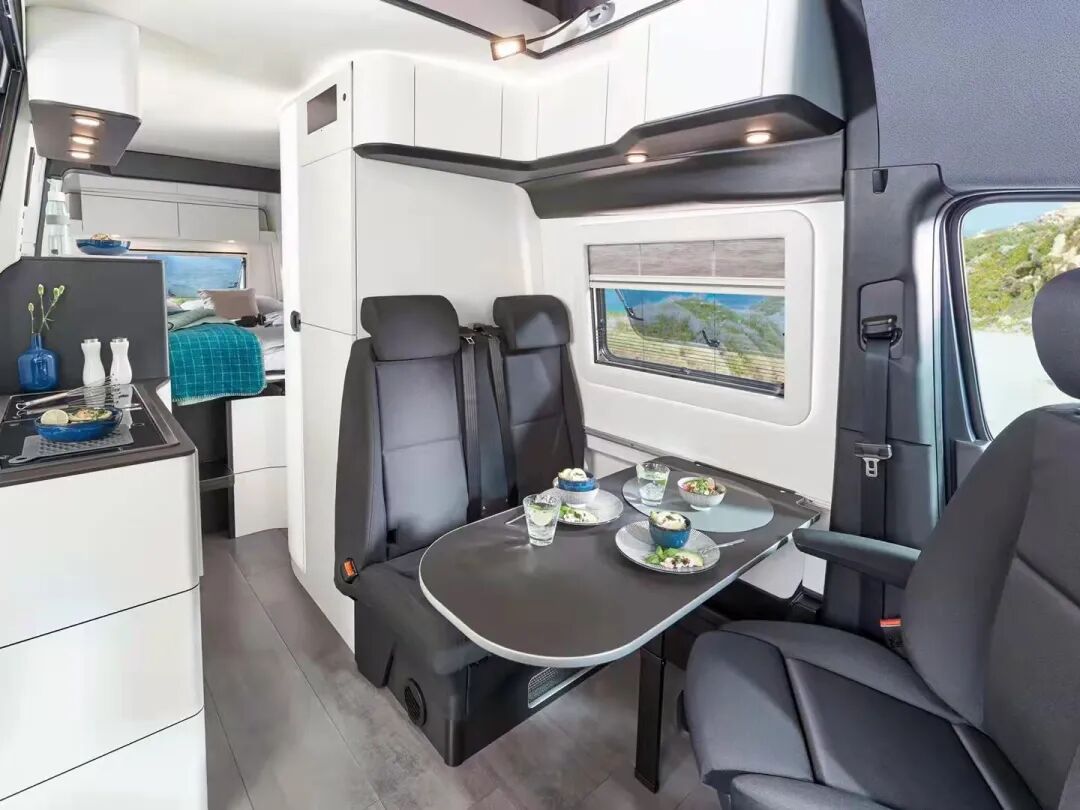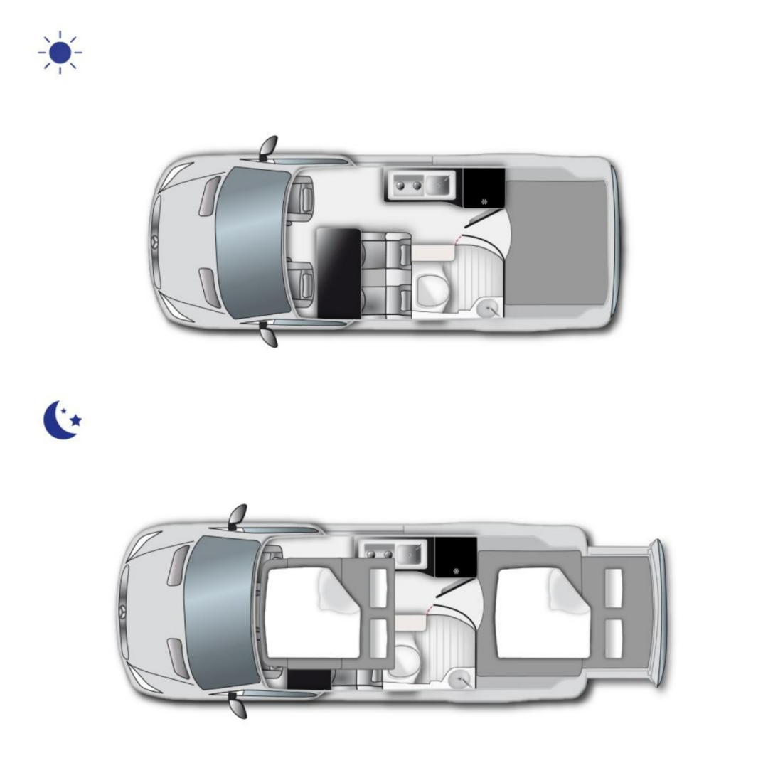 这款房车共有三个版本,第一种车型采用原车车顶,内部设有4个座位和2人床位;第二种版本增加了可升顶结构,可满足多人睡眠需求;最后一种顶级车型带有GRP材料打造的升顶结构及后方拓展机构,设有4个座位和4人床位。今天给大家介绍的是带有升顶结构、拓展结构的顶级车型。