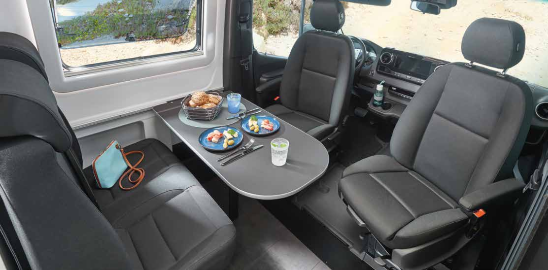 会客区设有单排双人真皮卡座,座椅带有安全带,保证行车乘坐安全;中间位置有一个圆角餐桌,供日常就餐使用;餐桌下方设有充电接口,方便电子产品充电。