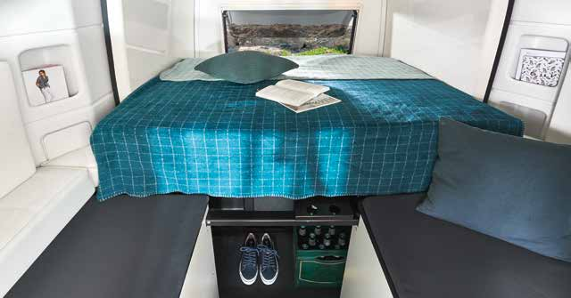 尾部休息区的拓展机构亦是这款房车的亮点之一。打开电动滑动系统后,James Cook房车尾部横置双人床可以拓展至2070x1400mm,睡起来非常宽敞;床上方的吊柜及下方的储物空间,可以存放一些物品,提高空间利用率。