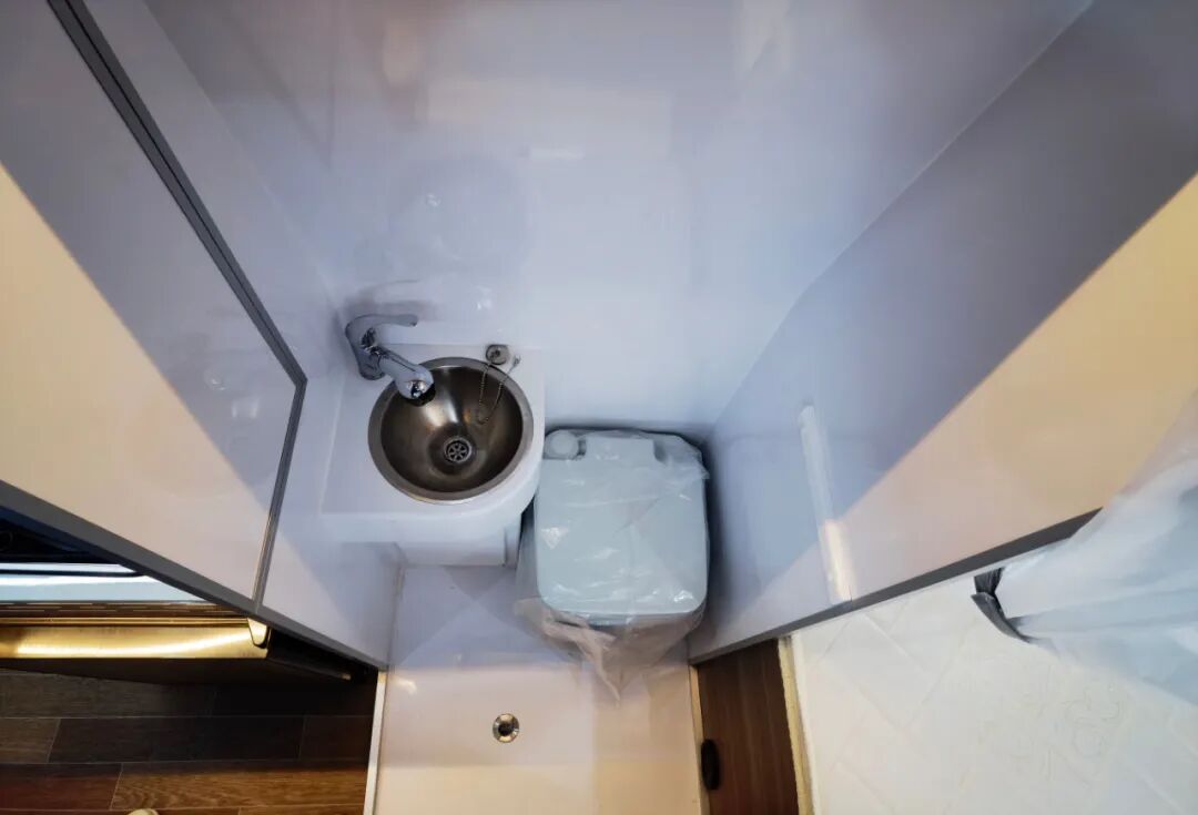 固定卫浴间采用半开放式设计,不使用时可有效节省空间,空间利用效率进一步提升;内部配置了便携式马桶、洗漱池、抽拉水龙头、浴帘等设施,可满足车上人员日常卫浴洗漱的需求;