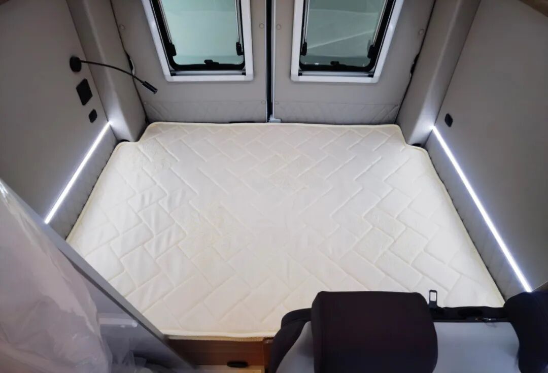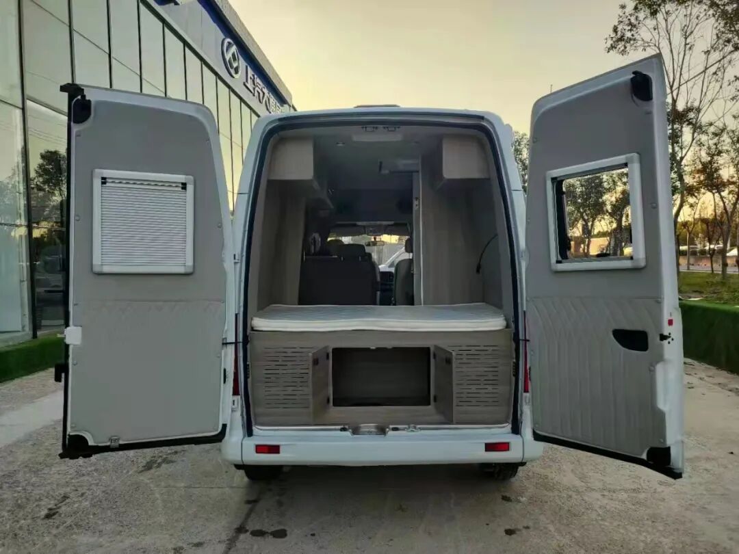 尾门双向对开式设计,内置横床可供两人睡眠;底部是隐藏式储物空间,顶部左右两侧搭载多组储物吊柜,车内储存空间非常丰富;