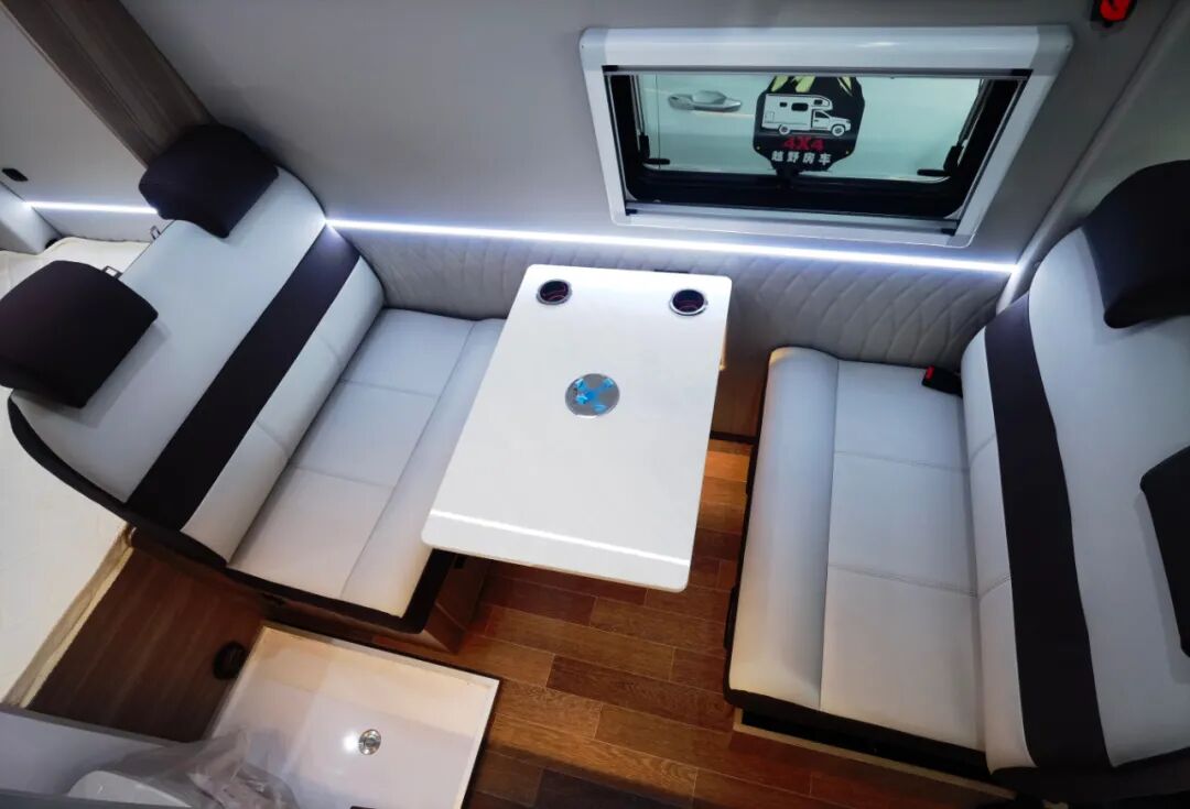 会客区采用双人对卡座的设计,均带有安全带便于行车时载人,整车最多可核载6人;中间升降式餐桌可供车上人员日常休闲、餐饮使用,也可搭配对卡座组成床铺供临时休息;
