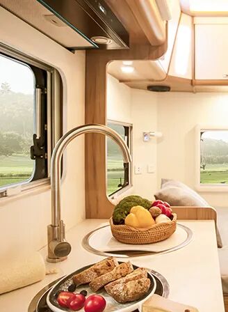 厨房区与会客区座椅相邻,配备一体式橱柜(带洗手池、电磁炉、橱柜)、抽油烟机、微波炉、房车专用153L大容量冰箱等,在雨天或不便于室外做饭的情况下,车内做饭同样没有问题。