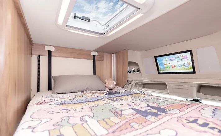 客厅顶部设有电动升降床,一键式升降操作,睡眠空间充足;此外,生活家V100小额头的生活区还设有新风换气系统、客厅MAX电动换气扇,进一步加强旅居生活的舒适度。