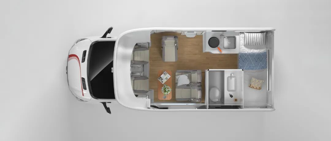 车内生活区规划合理,从左至右依次为驾驶舱、会客区、中部厨房区/卫浴区、尾部固定休息区,满足日常生活各项所需。