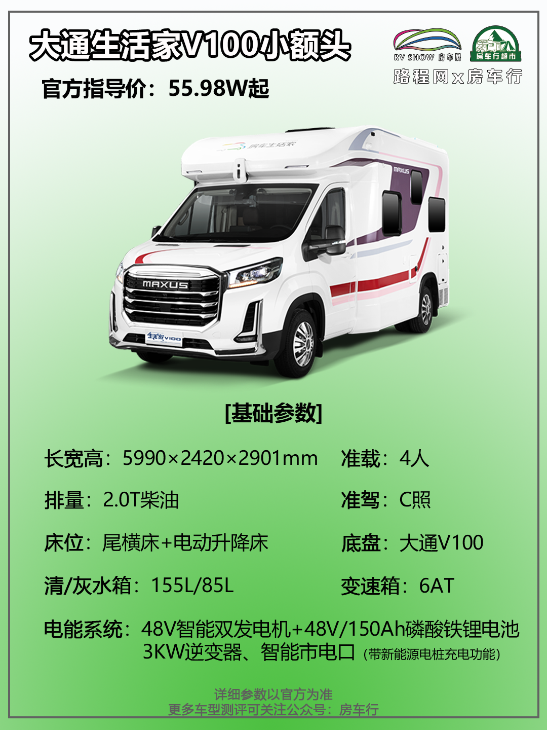 目前,生活家V100小额头房车的官方售价为55.98W起;对于那些不喜欢大额头房车,又想要拥有舒适生活空间的用户来说,上汽大通MAXUS生活家V100小额头房车或许是个不错的选择;小额头的设计使得房车看起来灵活性十足,具备良好的通过性能,内部生活区也较为宽敞,尤其在原厂房车独有智能黑科技的加持下,可以让你尽情享受“懒人式”美好房车生活。