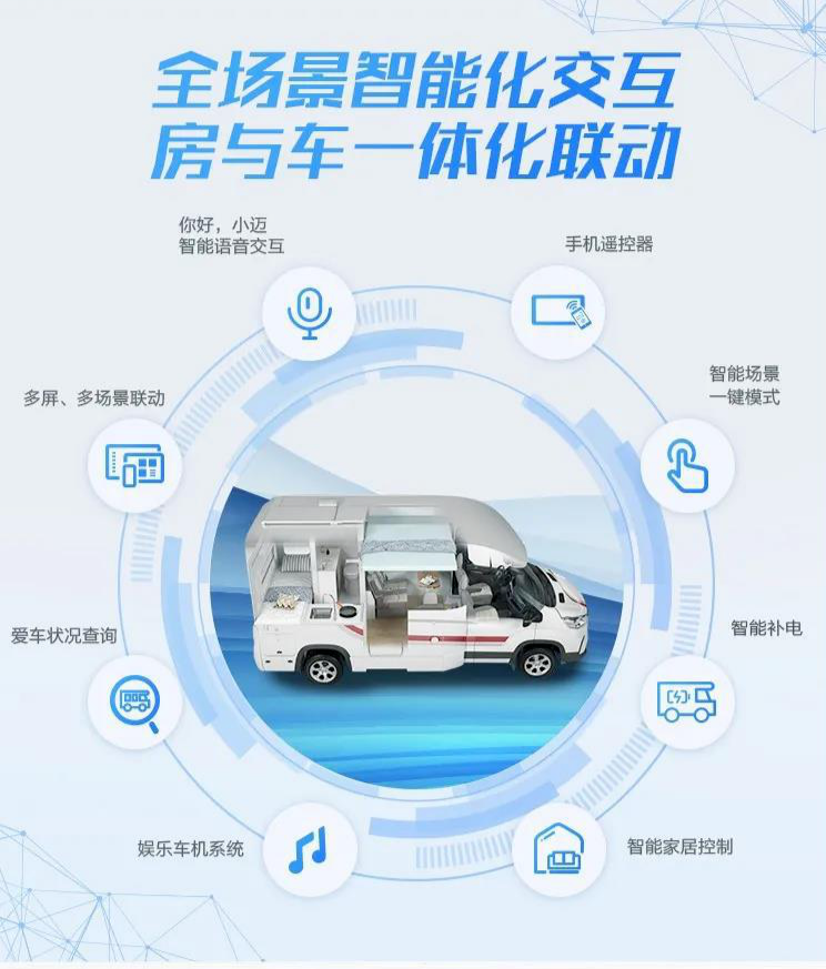 值得一提的是,生活家V100小额头房车同样搭载了全新蜘蛛智联系统,包含远程控制(远程控制:解锁、上锁驾驶门和房车中门,远程控制空调;车况查看:电池电量、清水箱、灰水箱水量、里程数、胎压、油量等)、腾讯TAI3.0车机系统,集腾讯生态丰富影音娱乐功能于一体,搭载车载微信,实现微信消息语音播报和回复,并能发起语音通话,使用便捷提升行车安全。搭载腾讯地图、微信小程序、音乐娱乐软件等,更智能更贴心。
