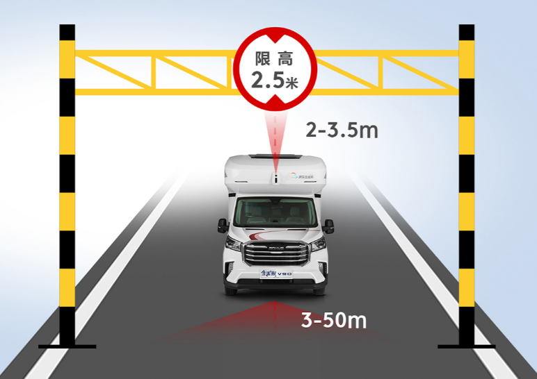 额头处搭载HLC限高防撞预警装置,该装置基于人眼仿生双目视觉算法打造,前向探测距离范围3-50米,纵向高度探测范围2-3.5米,能够精准识别房车前方限高杆、隧道入口、电线、牌坊、天桥等高度障碍物并及时预警,高效规避意外发生。