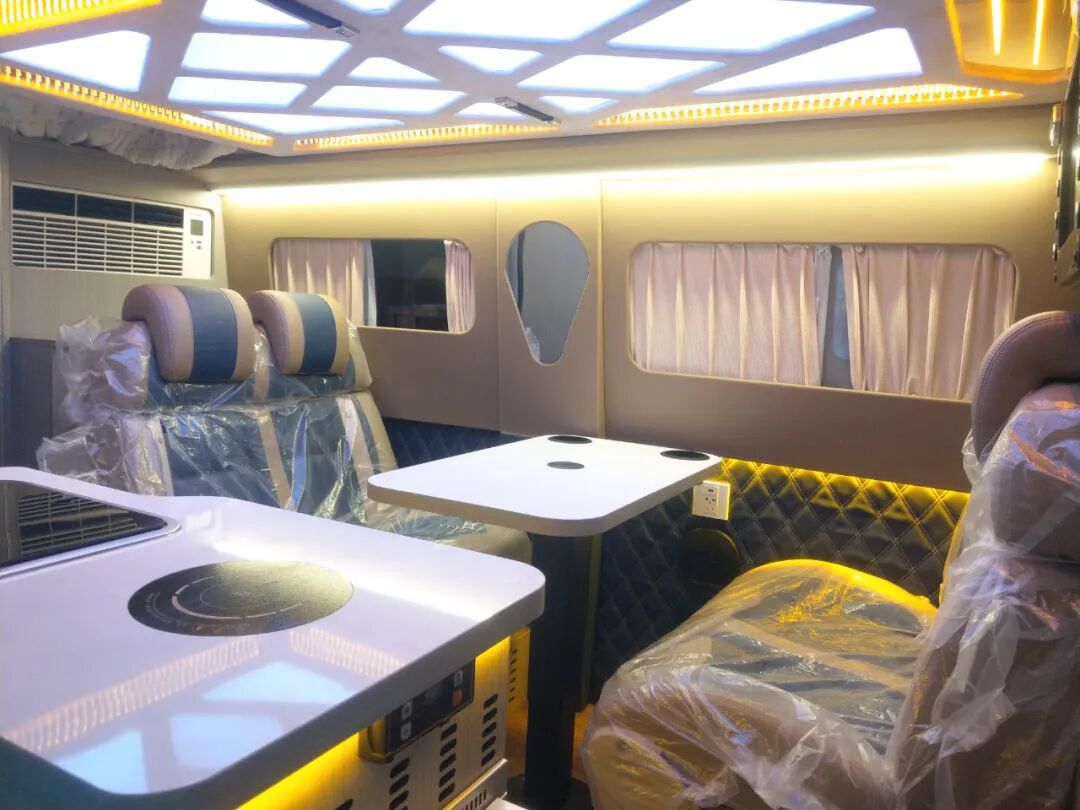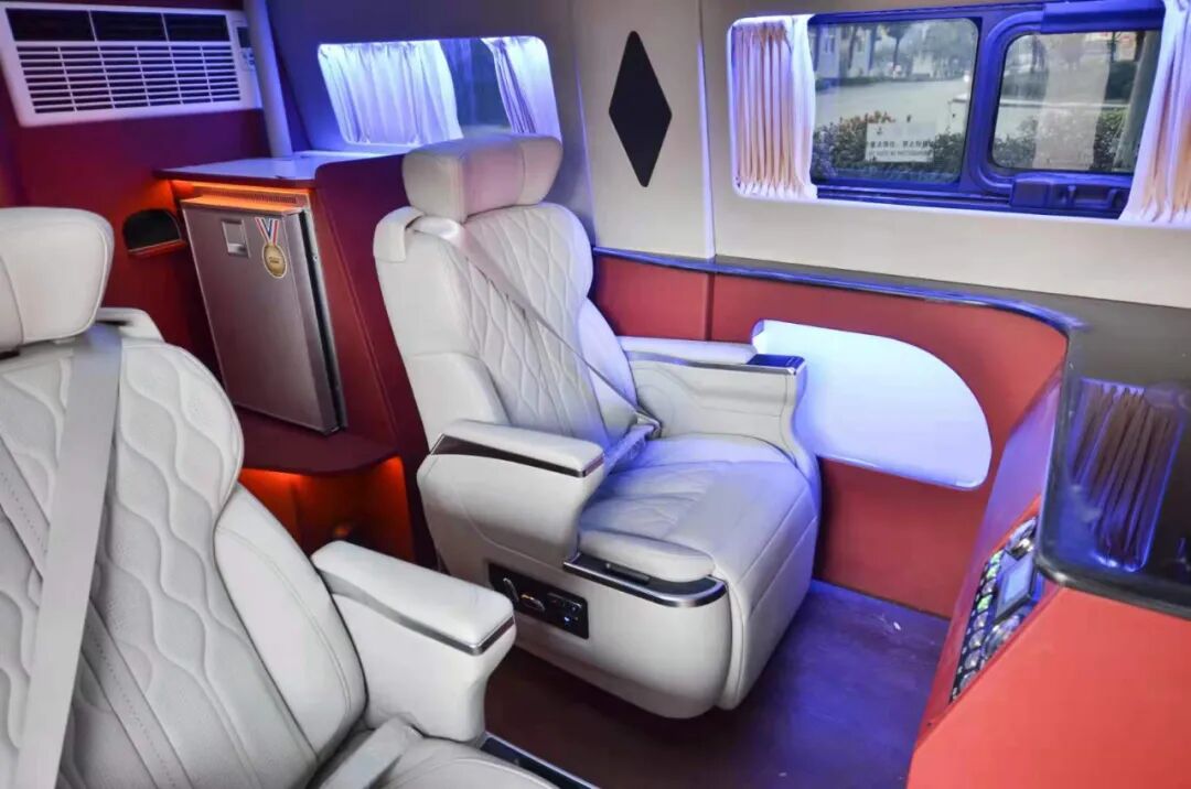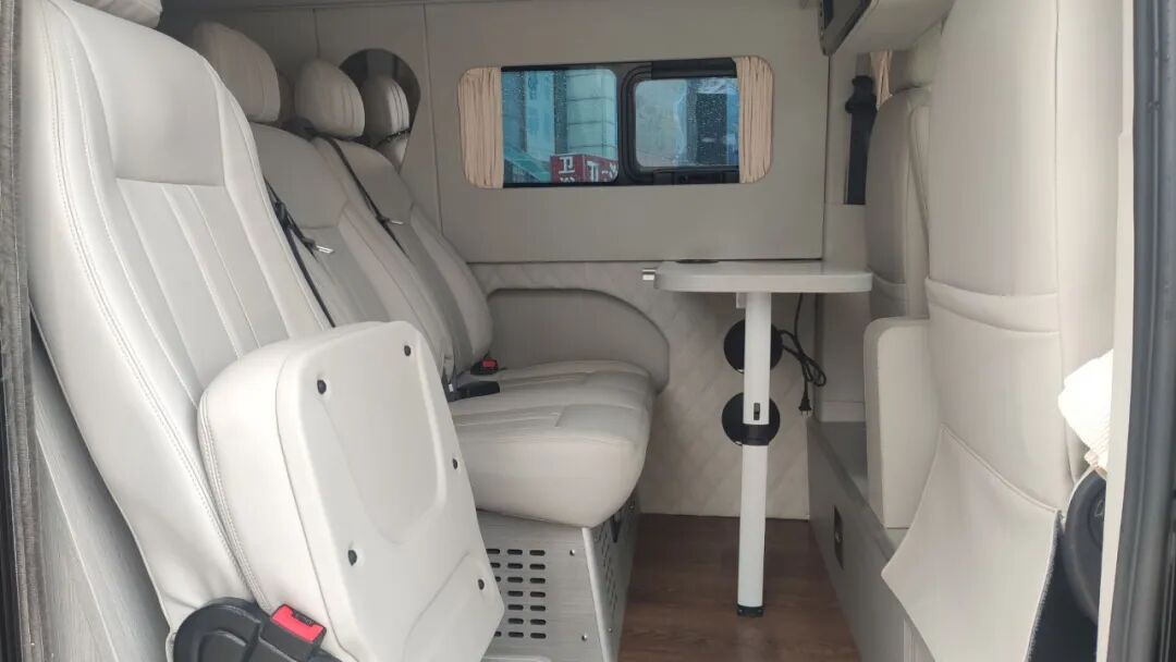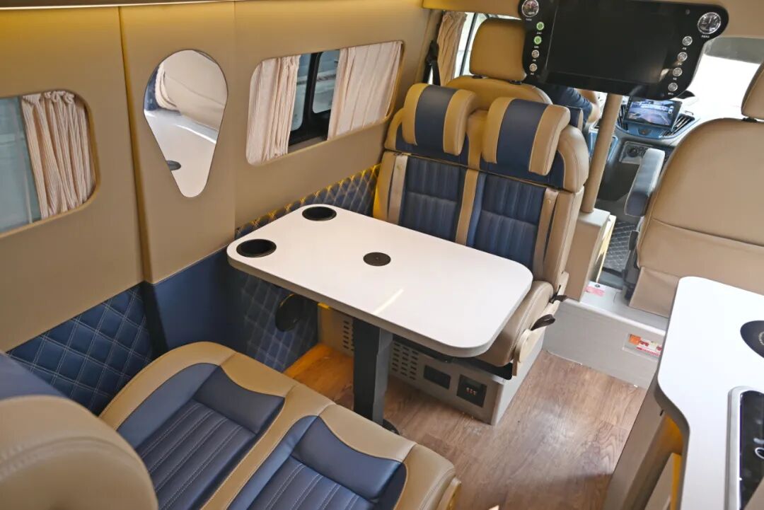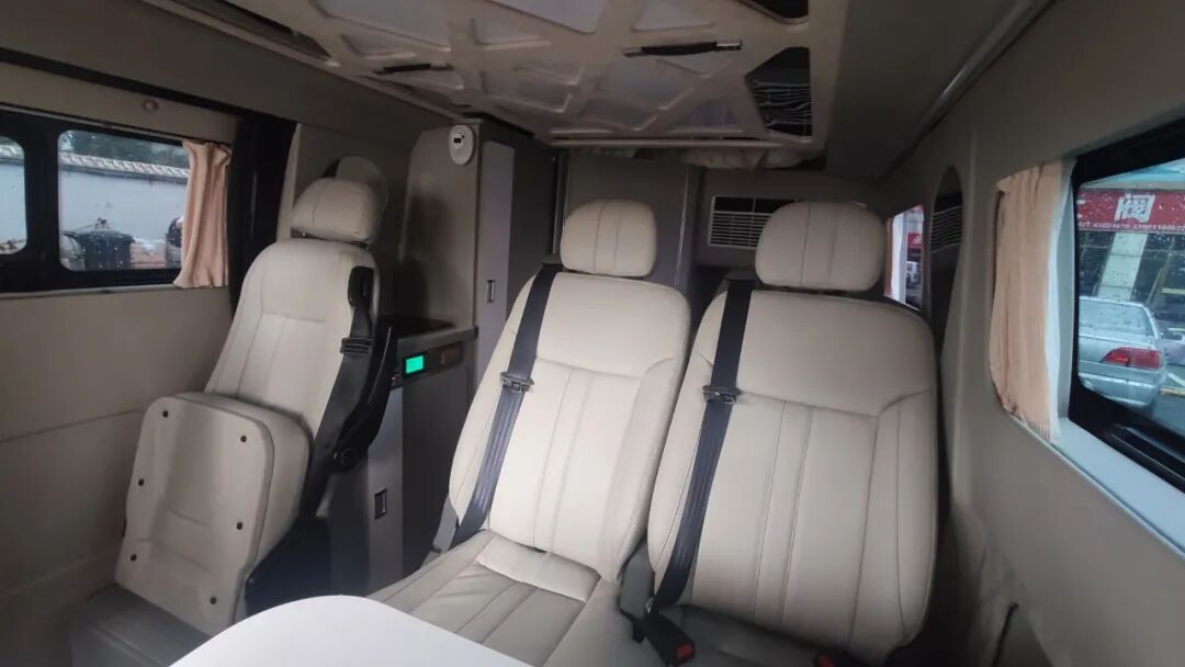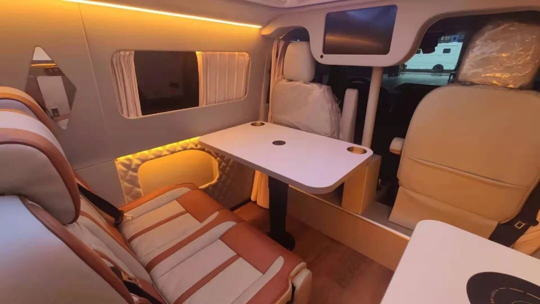 额定载客五人,五座布局表现在驾驶室前方2+1安全座椅,或会客区2+1(折叠导游椅)实现五座乘坐出行,双人卡座可通过操作气动升降桌板变成沙发床,拼成一张大床,配合顶部升顶大床。