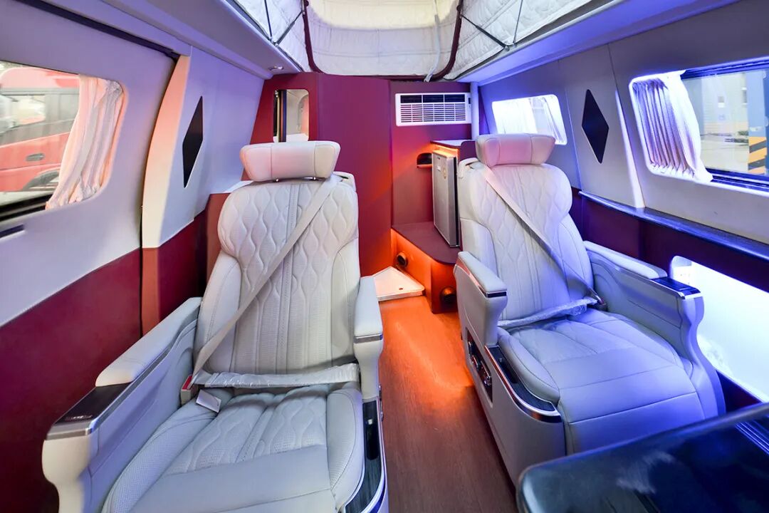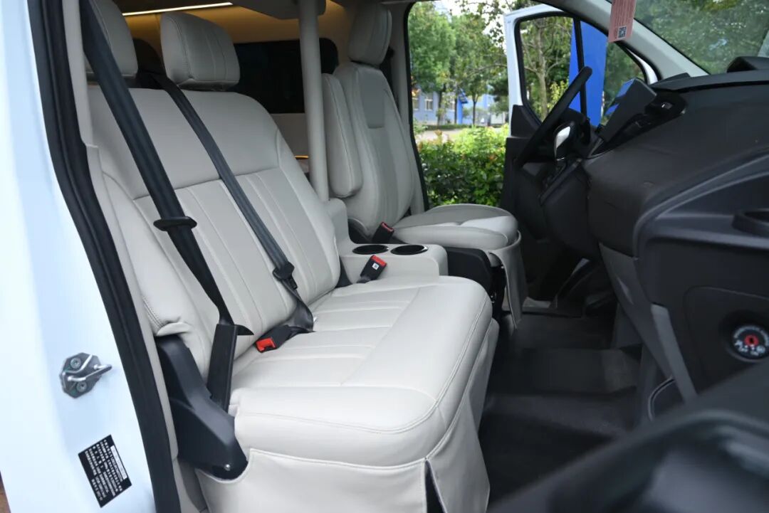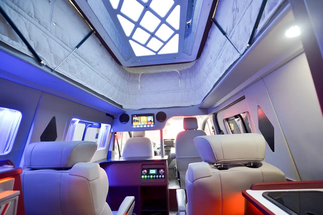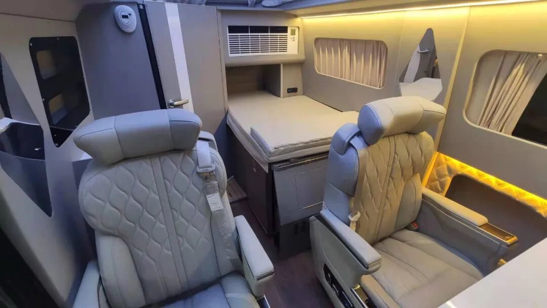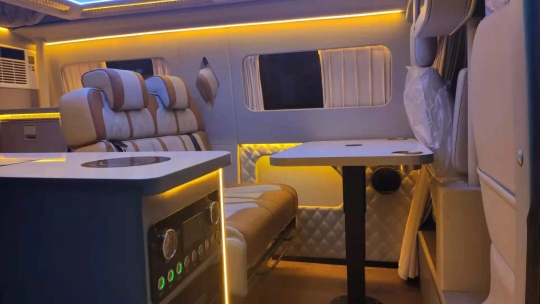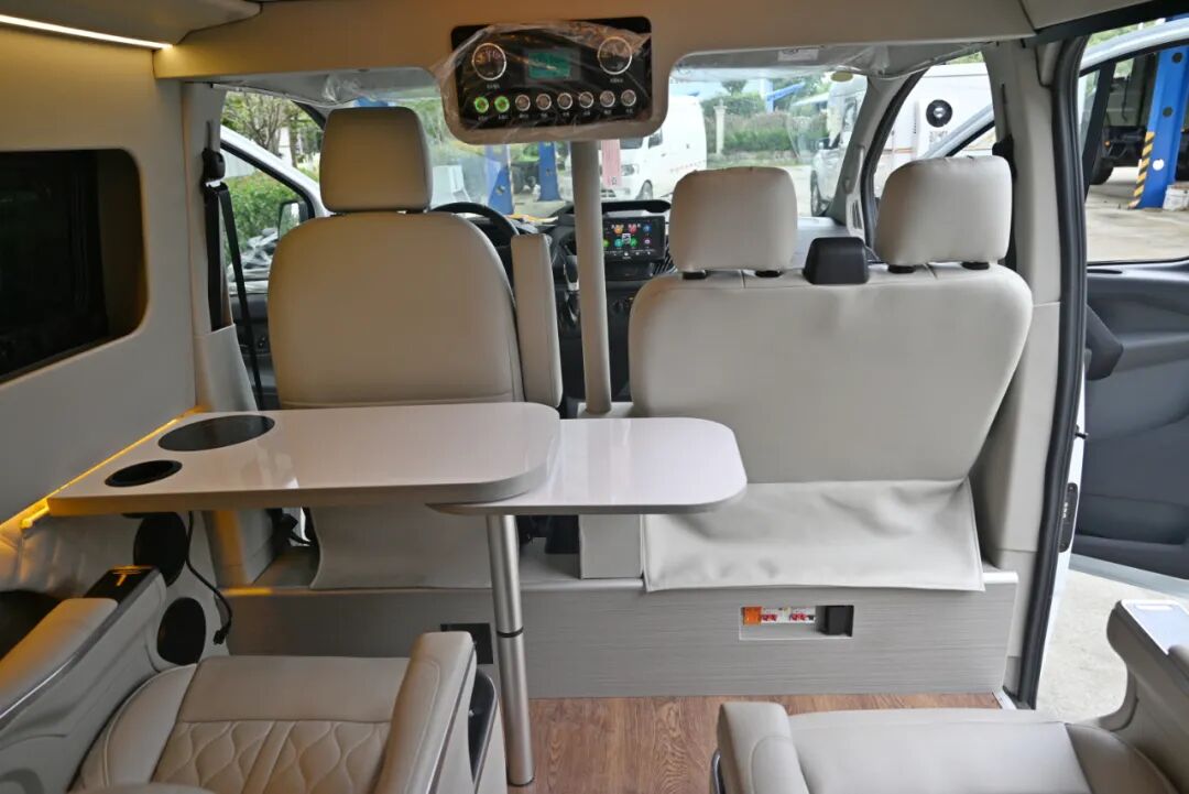 额定载客五人,五座布局表现在驾驶室前方2+1安全座椅,或会客区2+1(折叠导游椅)实现五座乘坐出行,双人卡座可通过操作气动升降桌板变成沙发床,拼成一张大床,配合顶部升顶大床。