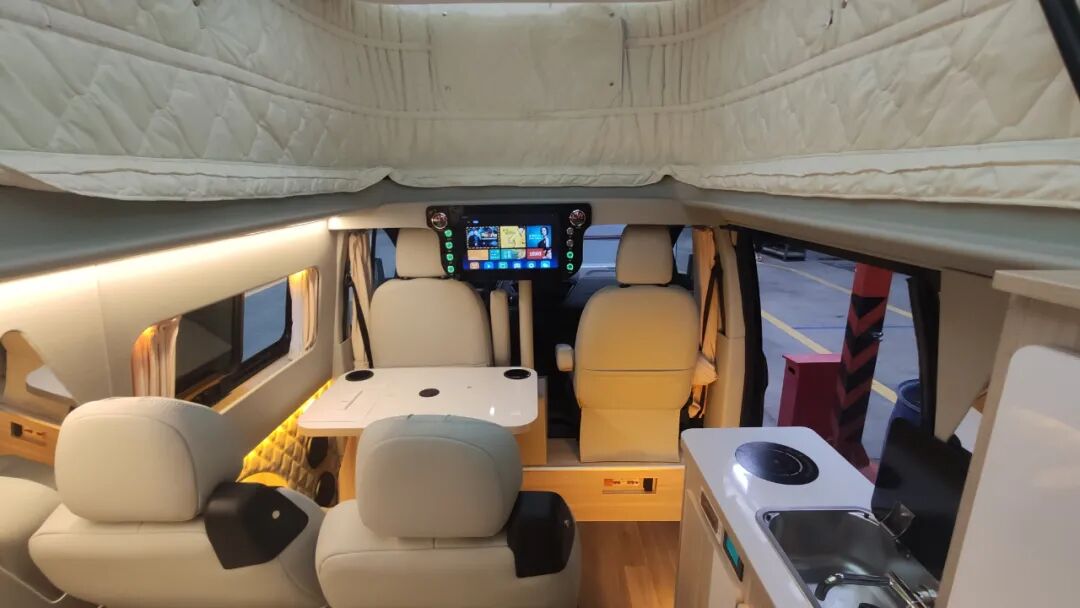 额定载客四人,一进门的位置是一个操作台,水电集中控制系统就在台面下方,方便操作,台面上有800W电磁炉和带翻盖的洗菜池,下方是储物柜,中部乘坐区是由双人卡座和气动升降桌组成,可通过操作变成沙发床,尺寸是1.85*1米,可睡下一个成年人,座椅可以前后滑动,调节脚步空间,商务桌上面有小米盒子的电视机,座椅后方有48L房车冰箱及12V变频空调,尾部有独立卫浴间,顶部有升顶大床。