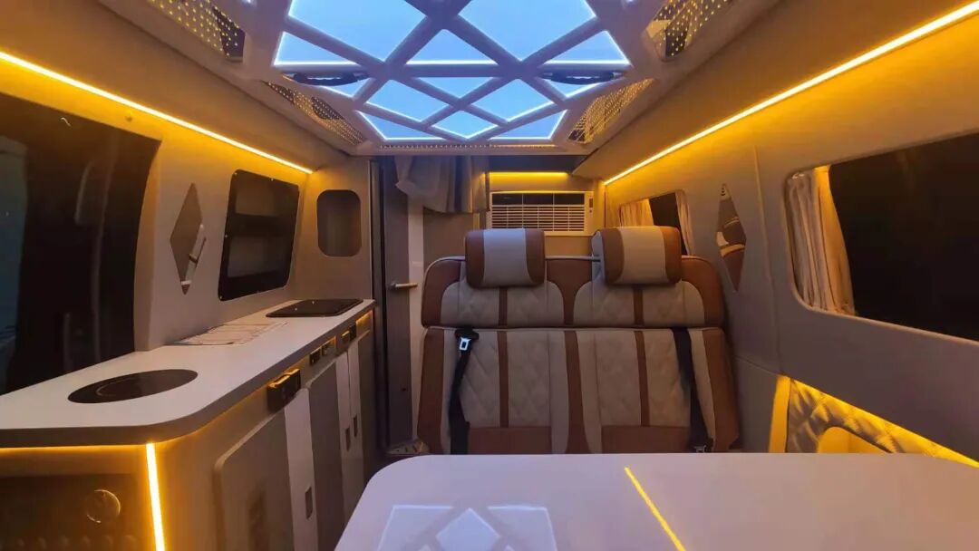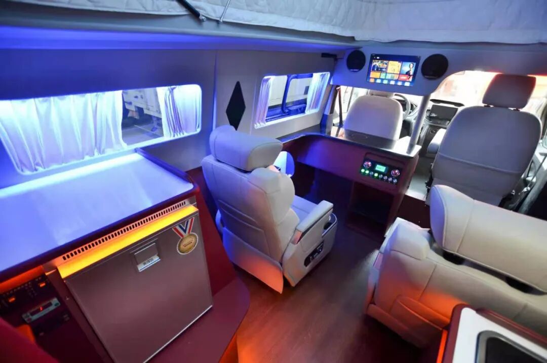 额定载客人数四人,后箱中部装有两个航空座椅,有加热通风和按摩等功能,底部有滑轨可以调节脚步空间,有脚托和靠背调节可躺下休息,座椅前方是工作台,台面上有800W电磁炉,台面下方有储物空间和水电控制系统,航空座椅后方有48L房车冰箱及12V变频空调,尾部有独立卫浴间和洗菜池台面,电视机在主副驾驶座椅后方,顶部有升顶大床。