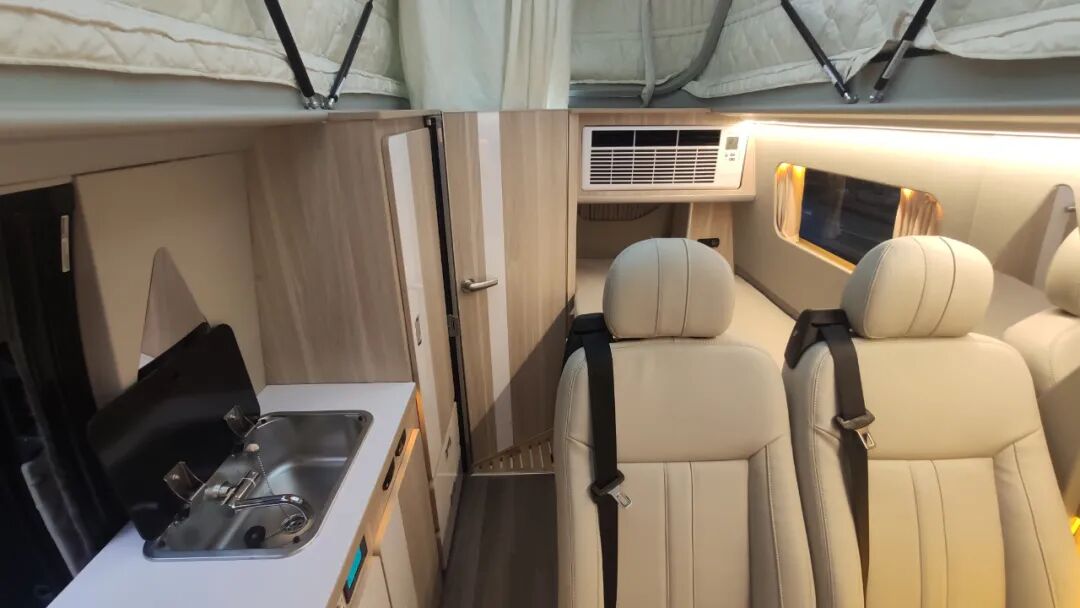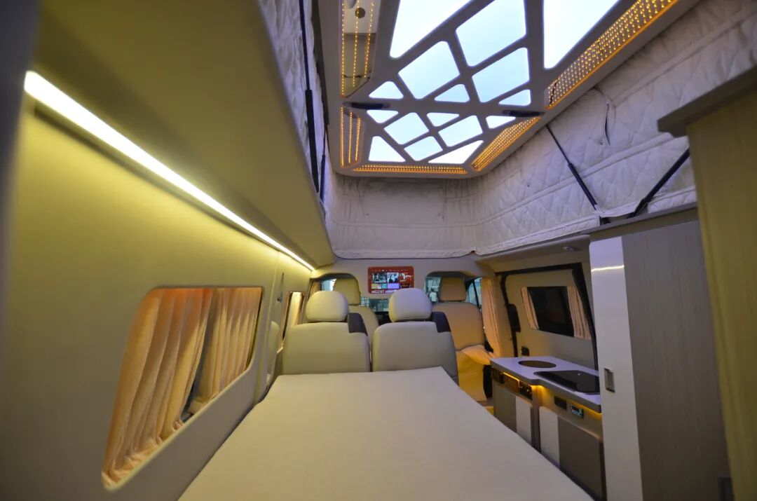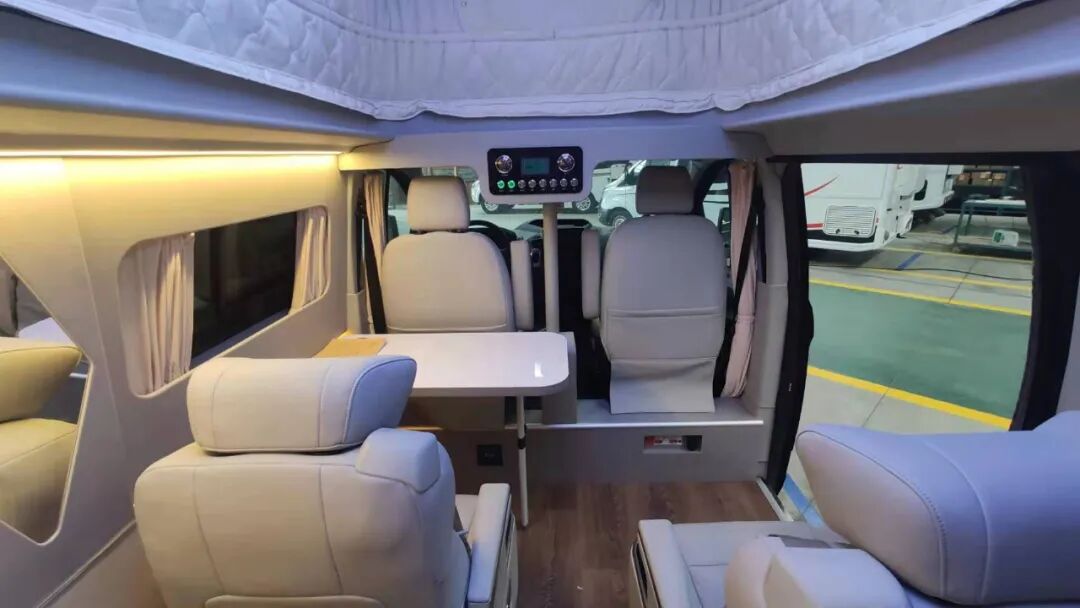 额定载客四人,中部有两个航空座椅,商务座采用的是便捷式折叠商务桌,不需要的情况下可以收起来存放,水电集中控制系统在主副驾驶座椅后方,航空座椅后方是一张1.85*1米的固定纵置床铺,调节航空座椅位置可延长床铺尺寸,床铺上方有12V变频空调,下方有48L房车冰箱以及储物空间,尾部有独立卫浴间,顶部有升顶大床。