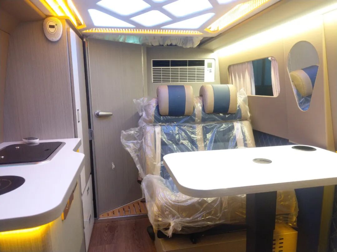 额定载客四人,一进门的位置是一个操作台,水电集中控制系统就在台面下方,方便操作,台面上有800W电磁炉和带翻盖的洗菜池,下方是储物柜,旁边还有衣柜,中部乘坐区是由双人座椅和升降桌组成,商务桌上面有小米盒子的电视机,座椅后方是一张1.85*1米的固定纵置床铺,床铺下方有48L房车冰箱以及储物空间,尾部有独立卫浴间,顶部有升顶大床。