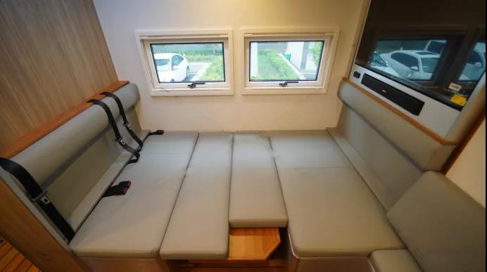 驾驶室后方是生活舱,采用进口配置,配有荷兰进口游艇级天窗、英国进口游艇级遮阳帘和防蚊网等设施,地面铺设顶级船用柚木地板,同时使用植物油抛光(无化工油漆),看起来非常美观;照明系统采用24V LED照明灯饰,搭配进口遥控开关;通风系统标配诺马迪森24V静音空调和无线遥控双向通风换气扇(带雨水感应),此外还配有德国进口4kw柴油暖风锅炉取暖系统,可用于提升严寒天气时车内温度。