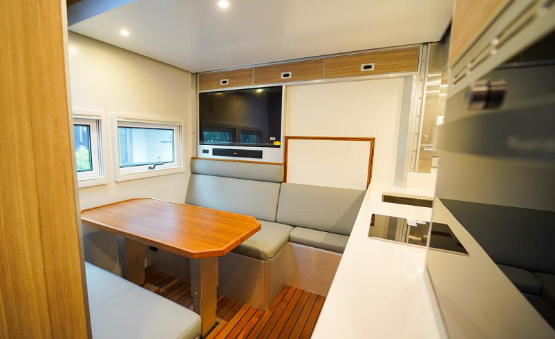 厨房区紧邻会客区,配有独立水龙头、洗菜池、德国2100kw单眼电磁炉、排脱油烟机、德国嵌入式蒸烤一体箱、全套德国厨具等,满足日常烹饪所需;厨柜下方的抽屉带锁,可防止行车时橱柜抽屉打开;冰箱采用诺马迪森152L分体嵌入式冰箱,分为左侧和右侧两部分,方便存放物品。