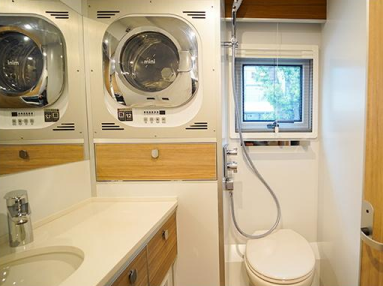 尾部卫浴区采用干湿混合设计,配备了独立水龙头、洗手盆、德国汉斯格雅自动恒温混水器和花洒、法国陶瓷电吸马桶、无线遥控双向换气扇(带雨水感应)、壁柜进口MINI滚筒洗衣机、PTC空气加热系统等,满足日常卫浴、盥洗需求;洗手盆下方设有储物空间,方便收纳洗漱用品。