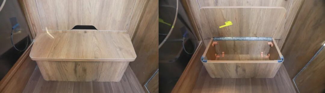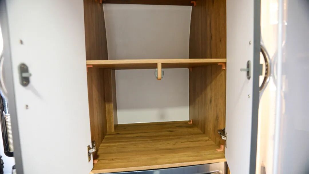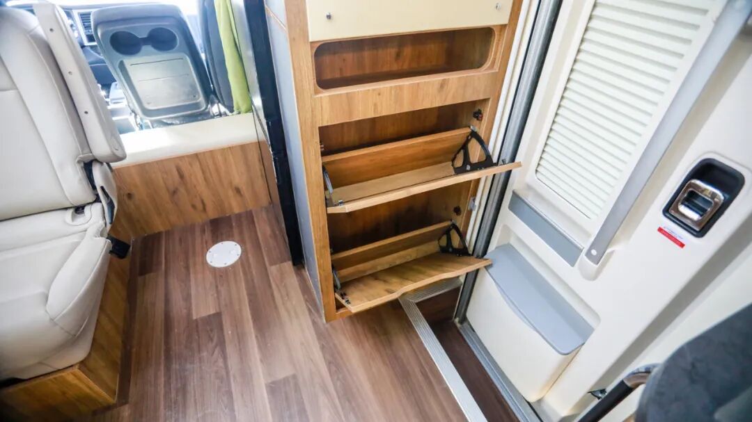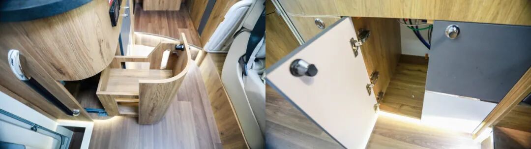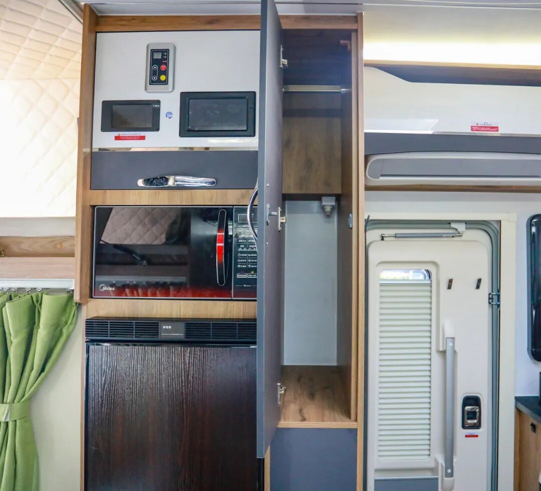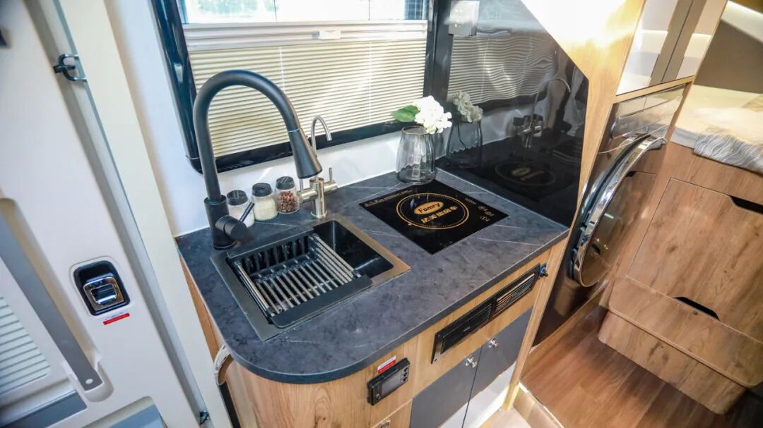 厨房区内部配置了嵌入式电磁炉、洗菜池(带沥水格)、独立水龙头、净水龙头、车载油烟机、外推窗等设施,日常车内做饭没有压力;侧方还有隔板防止油污乱溅,平时清洁也很方便;底部设有丰富的储物空间;