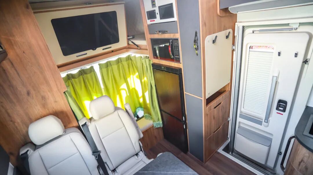副驾驶位座椅后方设有触摸式控制系统、微波炉、储物柜、独立小衣柜等;