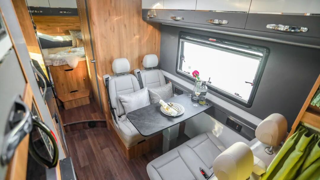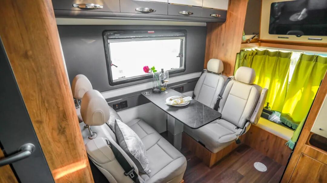 会客区双人对坐式商务座椅采用皮革包覆,乘坐舒适度大幅提升,并带有安全带便于行车时载人;中间升降式餐桌,侧方USB充电接口+五孔电源插座方便日常使用;而在夜间休息时,会客区还可拼成一张尺寸为2000x1000mm的单人床供睡眠使用;
