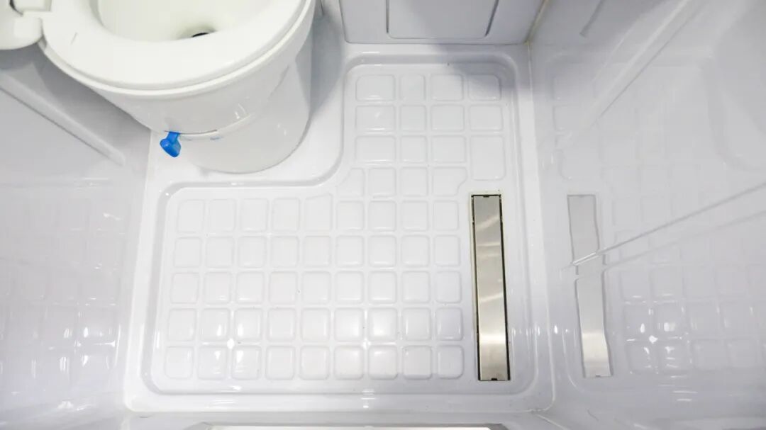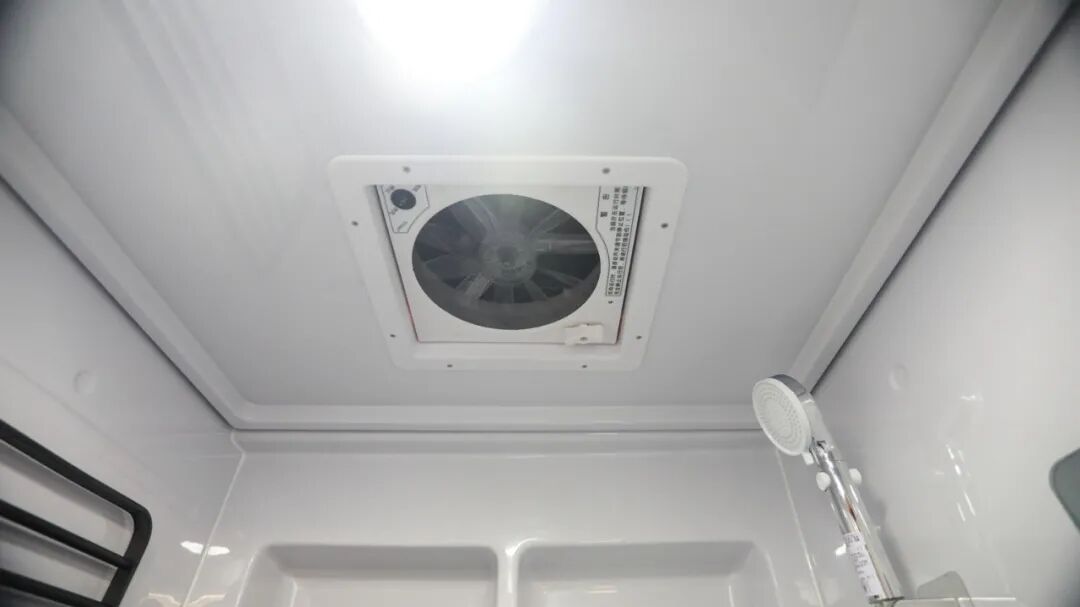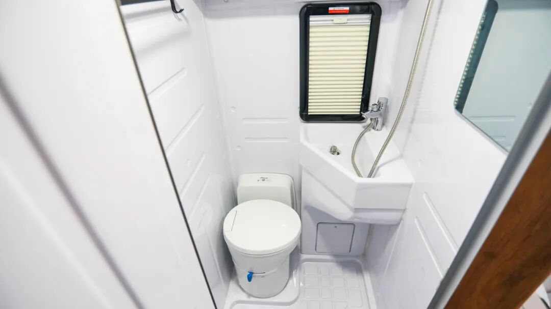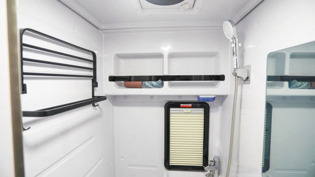 卫浴间采用整体式吸塑设计,质感光亮,并在防水、防腐、防电保护性方面有着出色表现;内部配有盒式马桶、毛巾架、水龙头+淋浴花洒、梳妆镜、置物柜、外推窗等设施,满足车上人员日常卫浴洗漱的需求;而独家专利的双能源热水系统采用热能(运用发动机冷却液循环加热)+电能(不锈钢内胆电力加热),能耗低,可为旅居生活提供24小时热水供应;