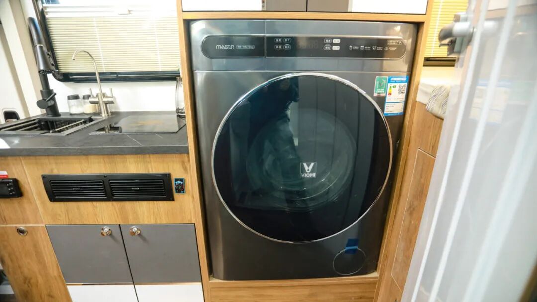 橱柜旁边内嵌一台10kg滚筒洗衣机,超大容量,解放双手,满足旅行时清洗衣物的需求;