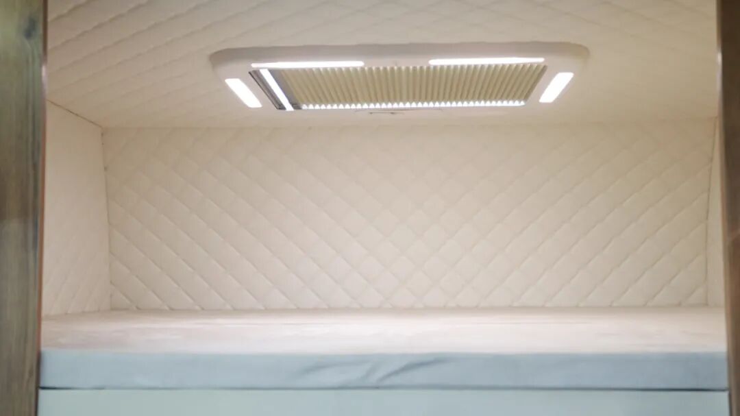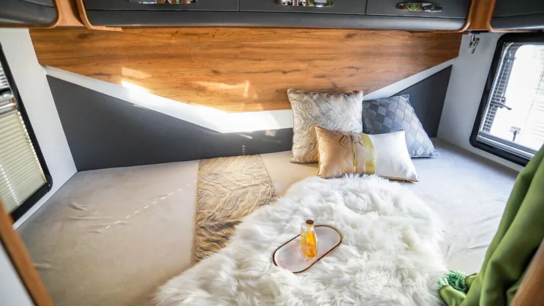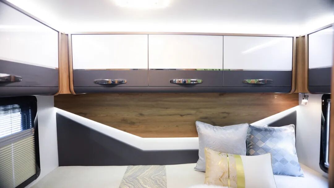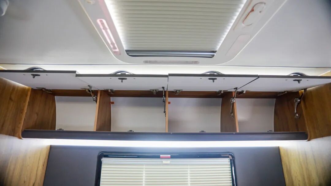 尾床顶部环绕着搭载了多组储物吊柜,进一步丰富储存空间;顶部照明灯;左右两侧外推窗加强通风、照明;内部还设有阅读灯、充电插座方便车上人员日常使用;
