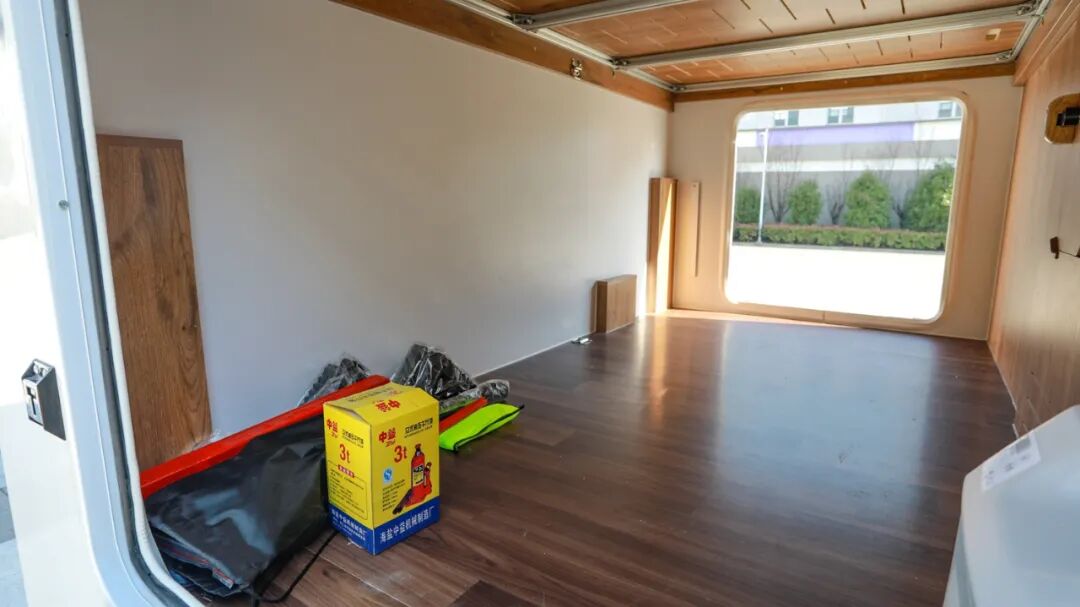固定休息区在车尾部分,内部横向放置一张双人床;底部设有踏步与多个隐藏式储物空间;