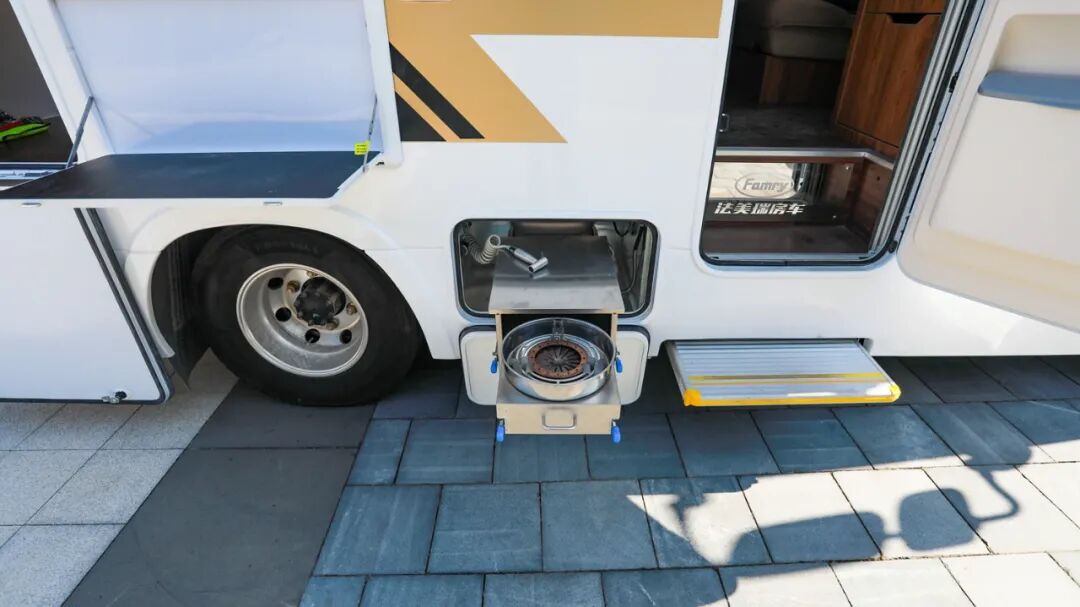 车身右侧设有联动房车专用门、4米户外遮阳棚、电动踏步、外置折叠餐板、户外照明灯、外置水枪、户外厨房(抽拉式柴油灶)等设施,满足户外驻车时的生活使用需求;