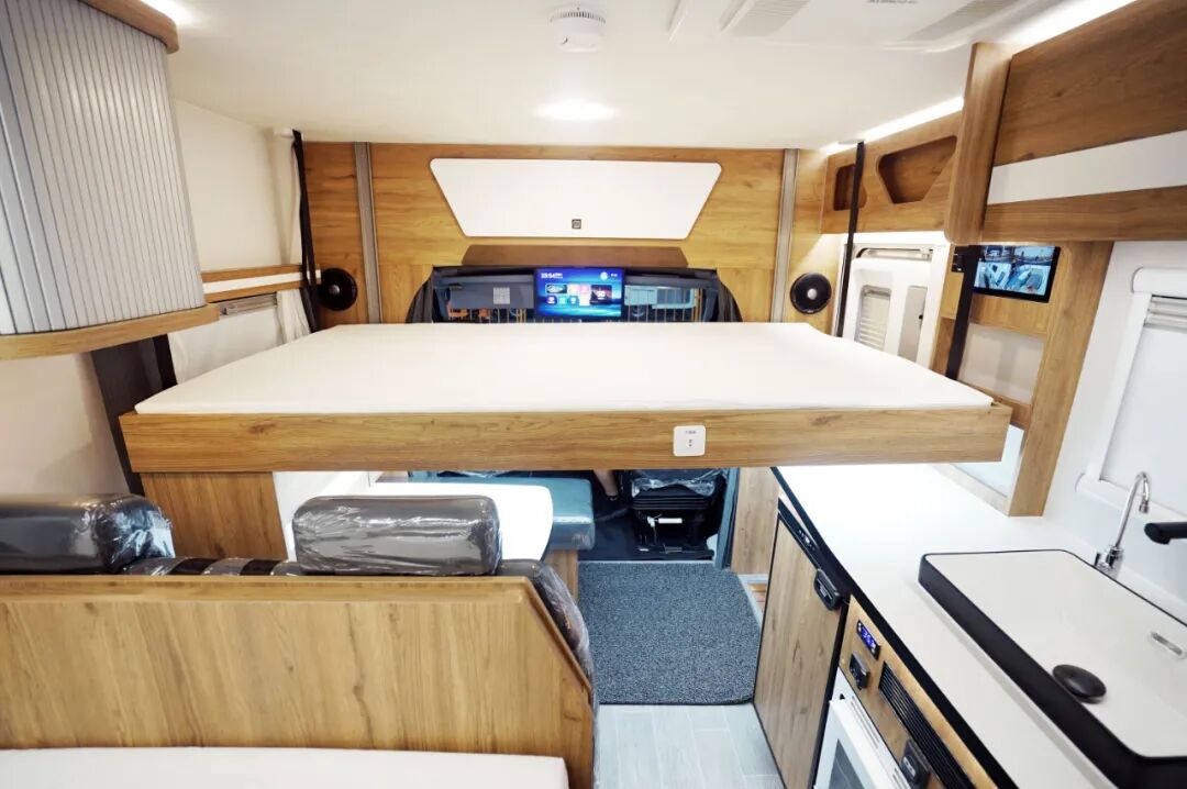 得益于新增的侧拓展机构,客厅的生活空间相较以往更加宽敞明亮;双人对卡座沙发可拼床,搭配固定的额头双人床以及客厅顶部的升降吊床,整车睡眠空间同样充分;