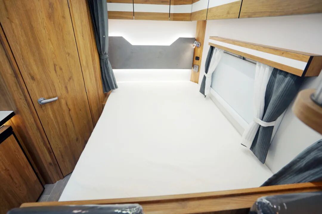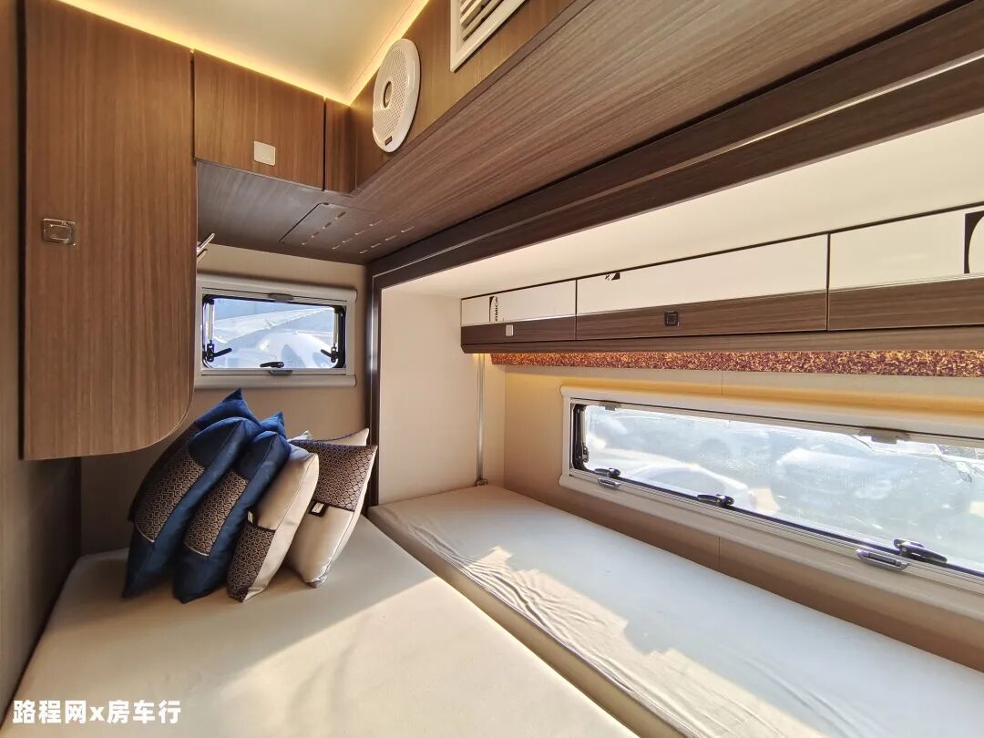 尾部纵置双人大床配有超柔软床垫,可供多人舒适睡眠;侧方大尺寸外推窗;顶部设有雨感排风扇、储物吊柜、家用空调等;