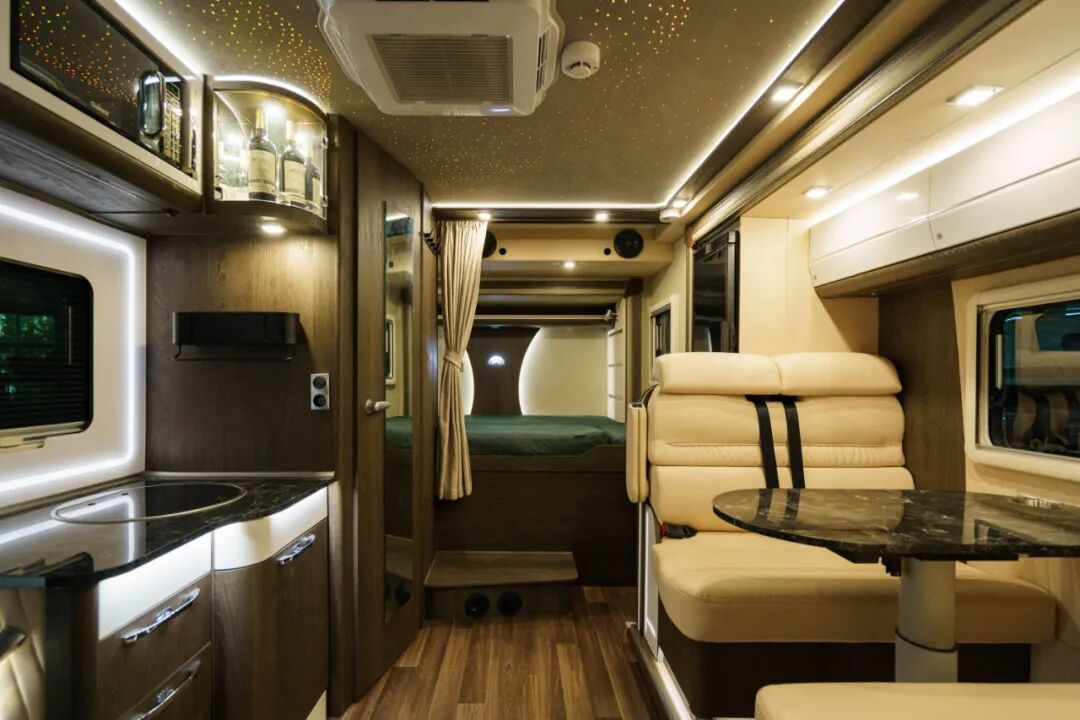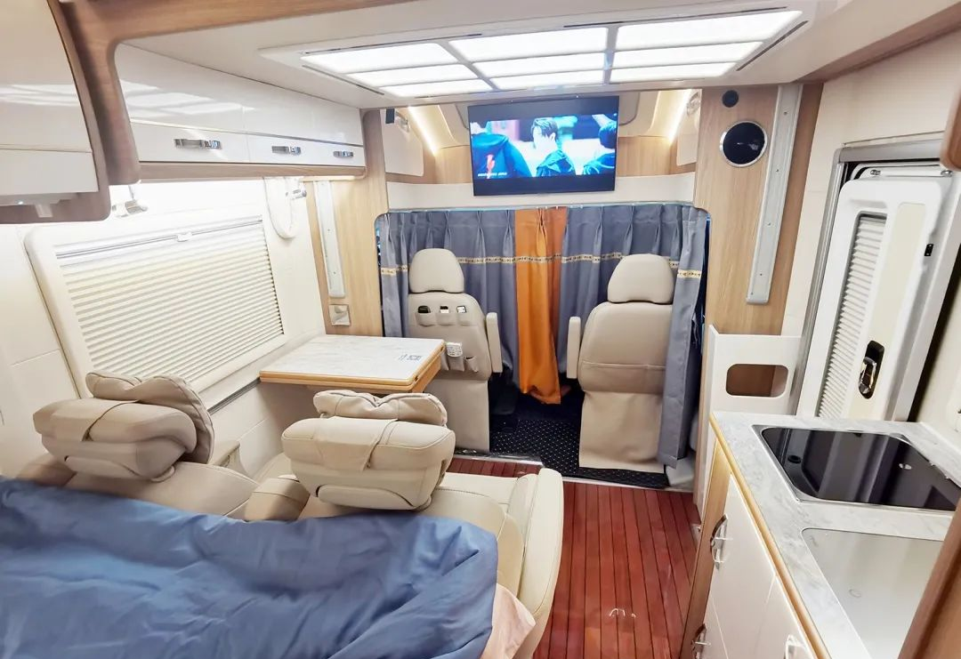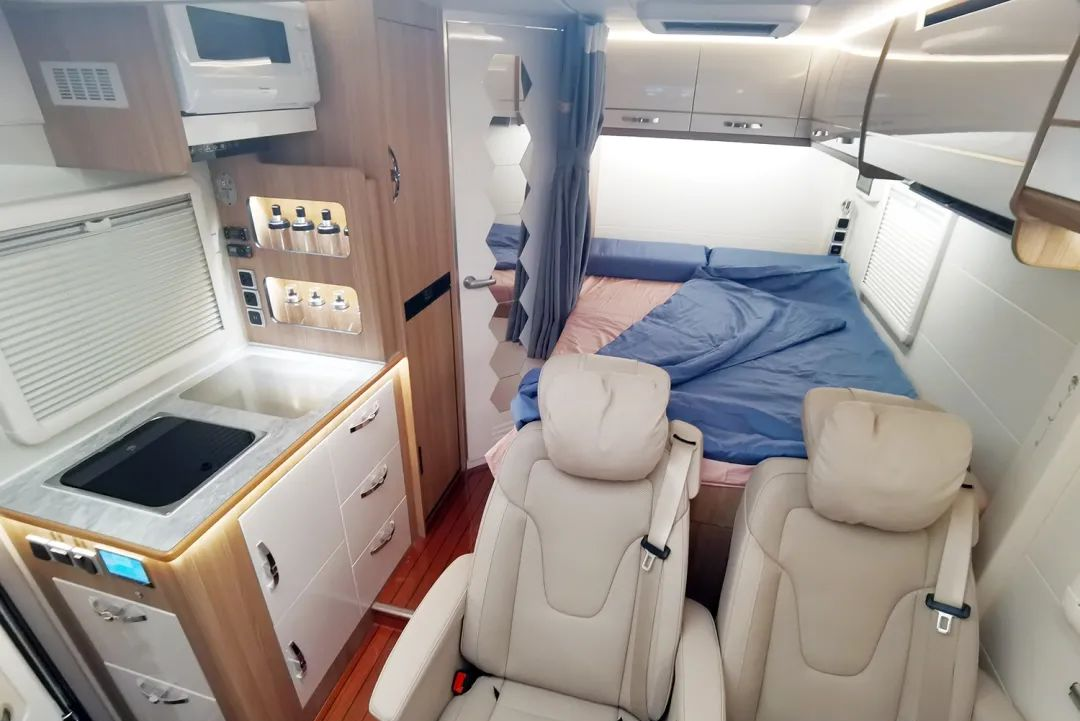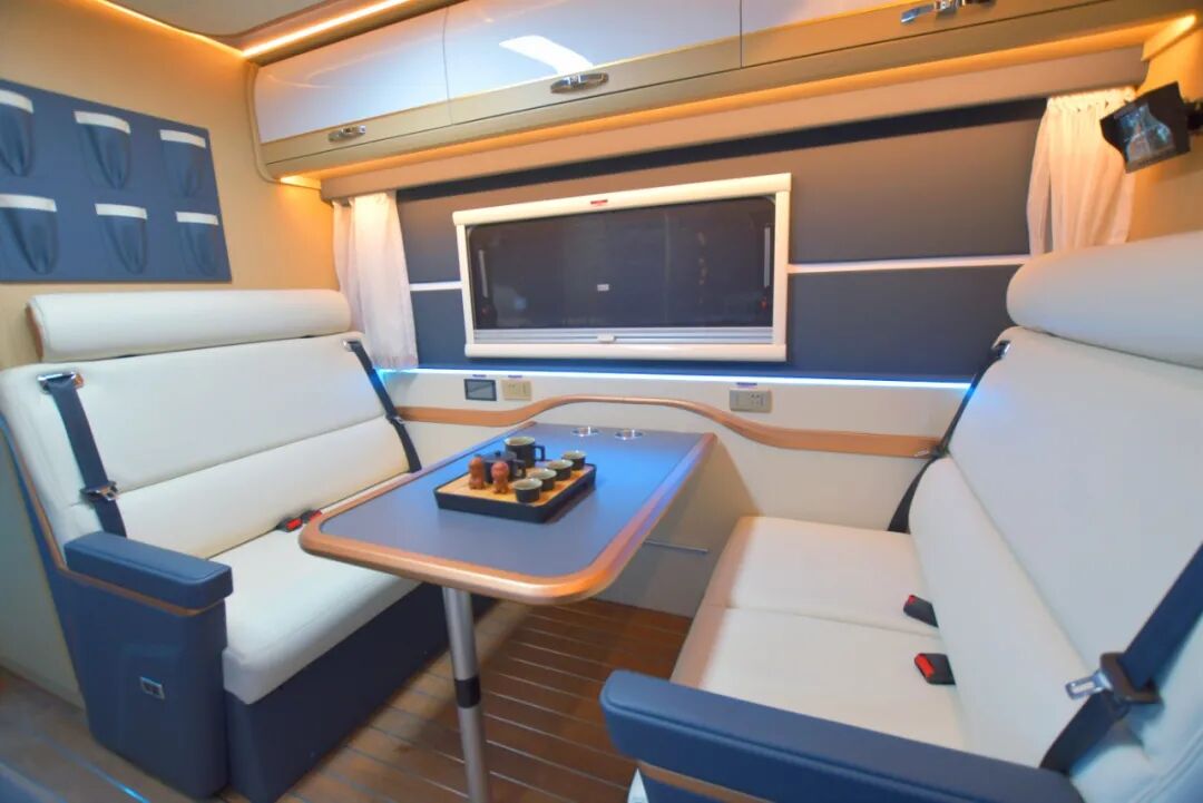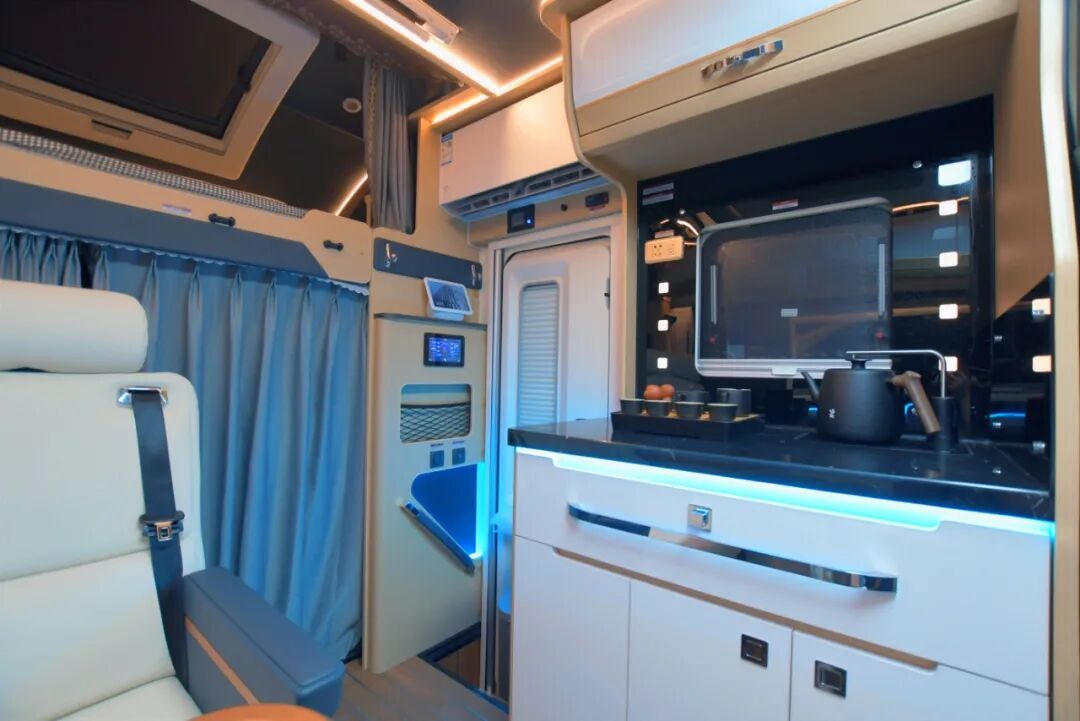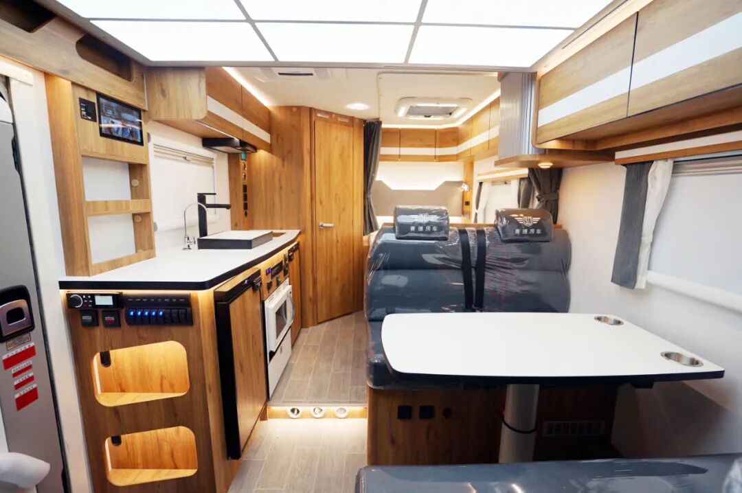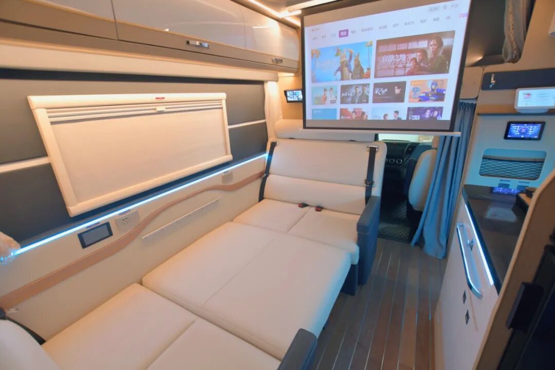 内饰整体偏向商务风,豪华家具、氛围灯带、顶灯,营造豪华商务办公氛围;额头处设有触屏电视以及丰富的储存空间;右侧厨房区配备了微波炉、电磁炉、洗手池、两台支持温度调节的英得尔电冰箱等,可以在车内进行简单的烹饪,也可搭配户外厨房使用;整车带有新风系统、直饮水系统,日常生活舒适性有保障;