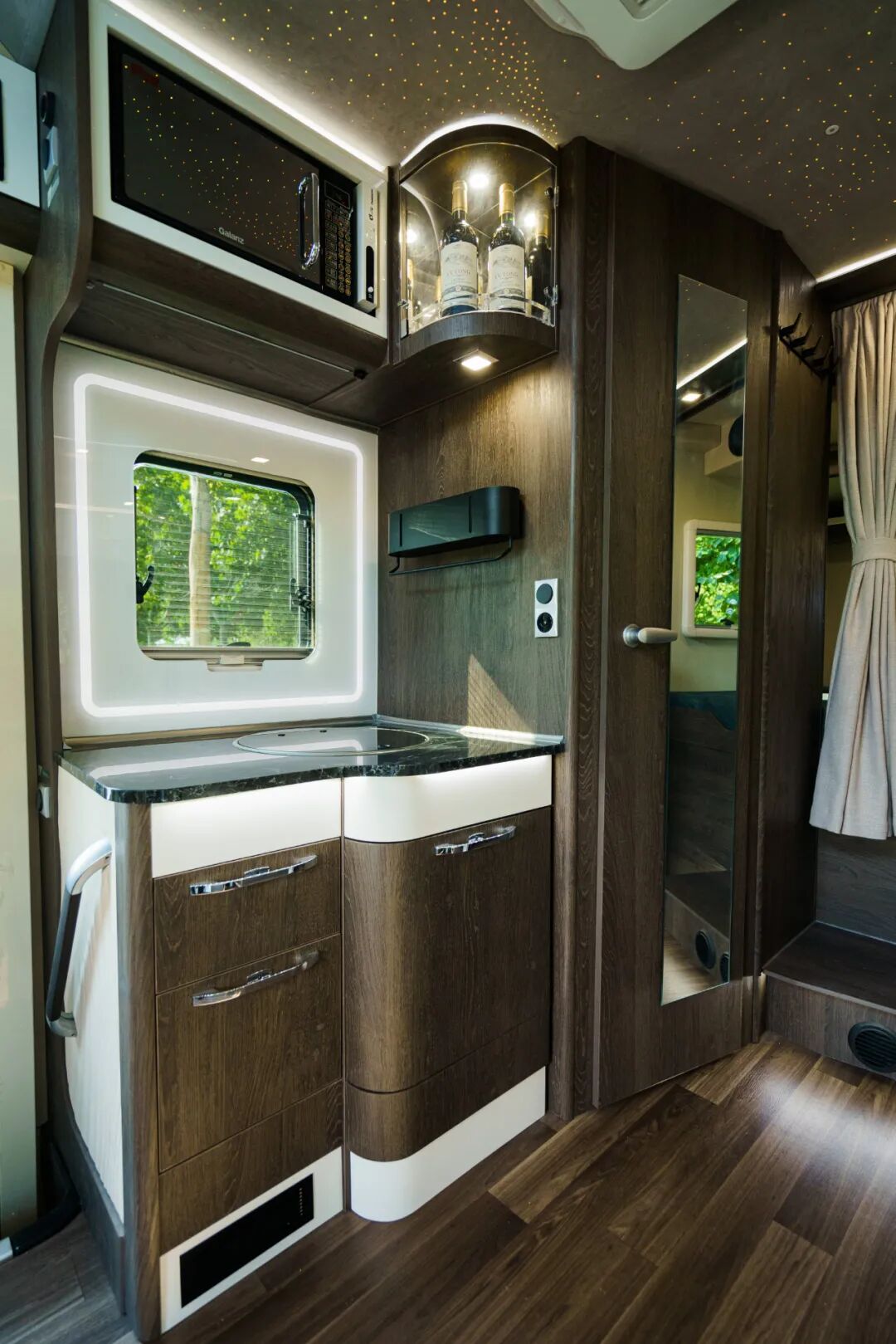独立封闭式厨房间配有超大操作台面、电磁炉、微波炉、洗菜池、独立水龙头、丰富的储物空间等,超大操作空间,充分满足日常车内烹饪;