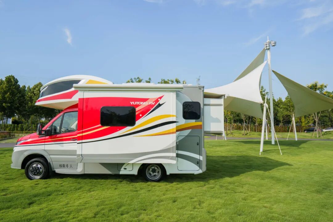 外观方面突破传统设计风格,紫金冠渐变色额头,棱角分明的外轮廓,钻石切割般的质感,细节满满的设计着实让人眼前一亮;整车车身外尺寸为5990×2320×3280mm,上蓝牌,C照即可驾驶;外部设有遮阳棚、贯通式储物舱、户外厨房、抽拉式置物台等;